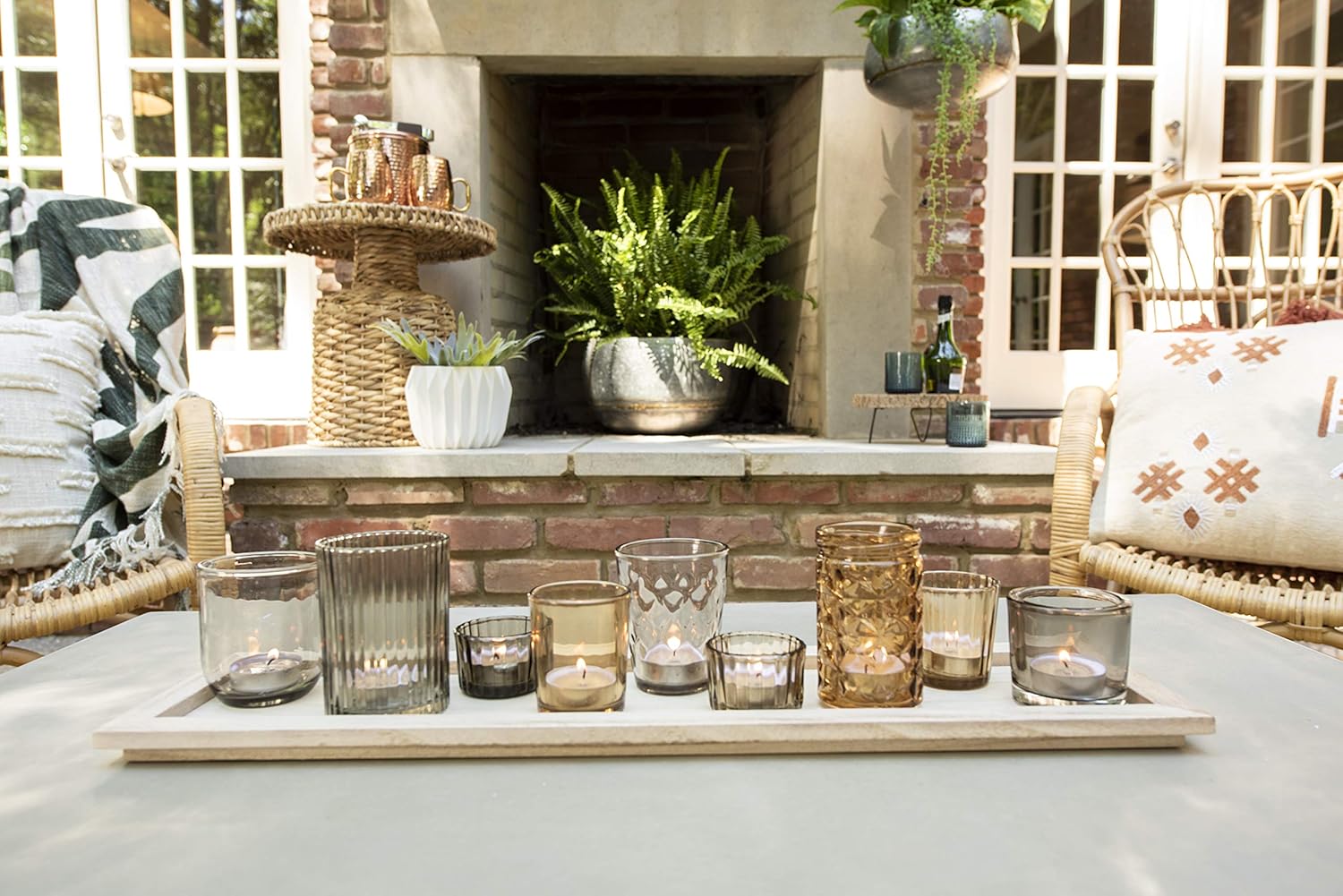 - Wood tray with glass votives of varying sizes, shapes and hues of brown