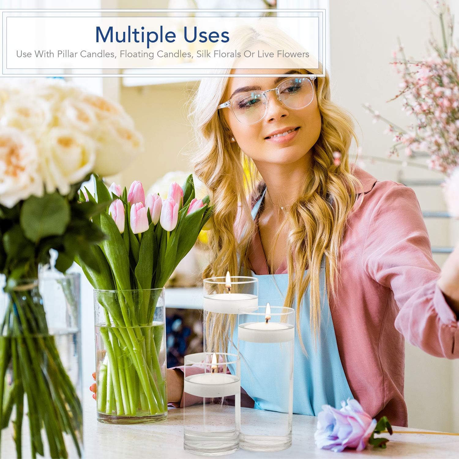 - Packaging: Each set of 3 cylinder candle holders is packaged in a strong cardboard box and wrapped in bubble-wrap for ultimate protection. Set includes 3.5 inch wide vases in 3 different heights – 6”, 7.5”, 10.5”, plus 3 floating candles. Total – 6 pc set.