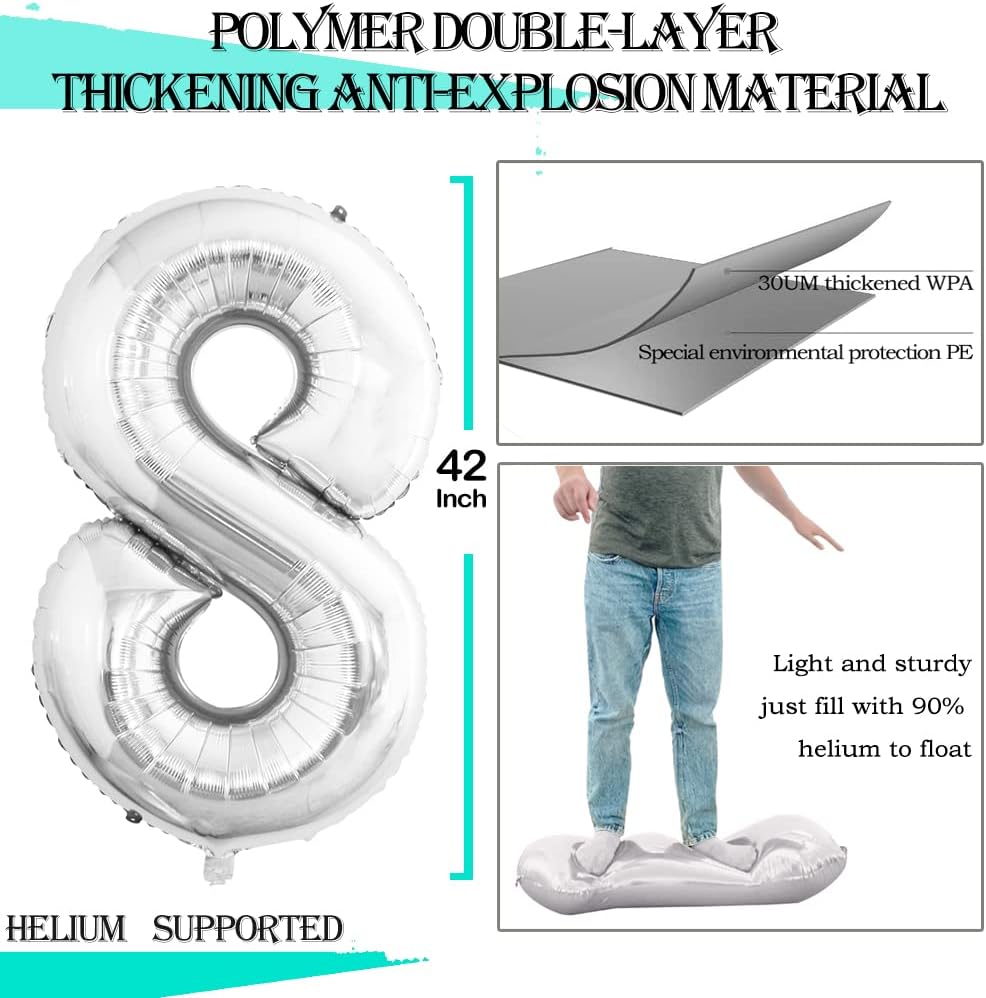 GOER Silver Foil Balloons Number 8,Huge Number Balloons for 8th Birthday Party Supplies Anniversary Decorations(3 pcs,42 inch,32 inc,16inch)