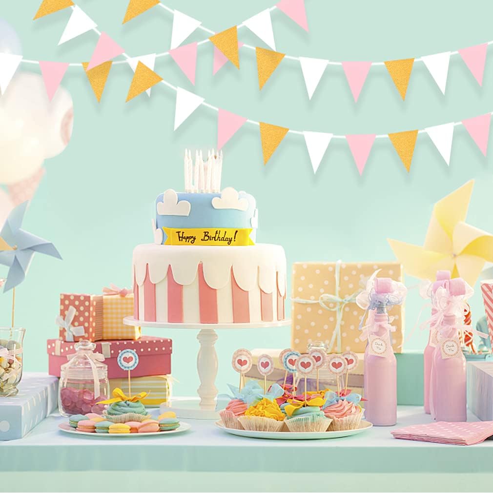 MerryNine Triangle Flag Bunting Banner, 3 Pack 30 Feet Vintage Style Pennant Banner for Wedding, Baby Shower, Event & Party Supplies 45pcs Flags (Triangle Flag - Pink White Gold Glitter)