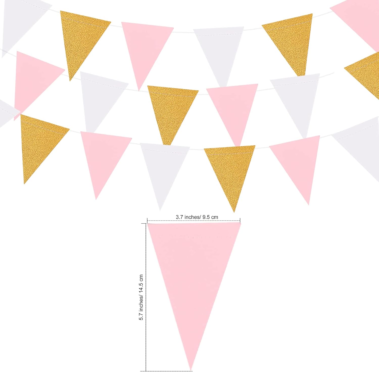 - WHAT YOU GET - MerryNine Paper Triangle Flags Set come with 3-String Pack, each string hangs 10 Feet (30 feets and 45 flags in total) and each triangle flag is approximately 5.7 inch in length and 3.7 inch in width.
