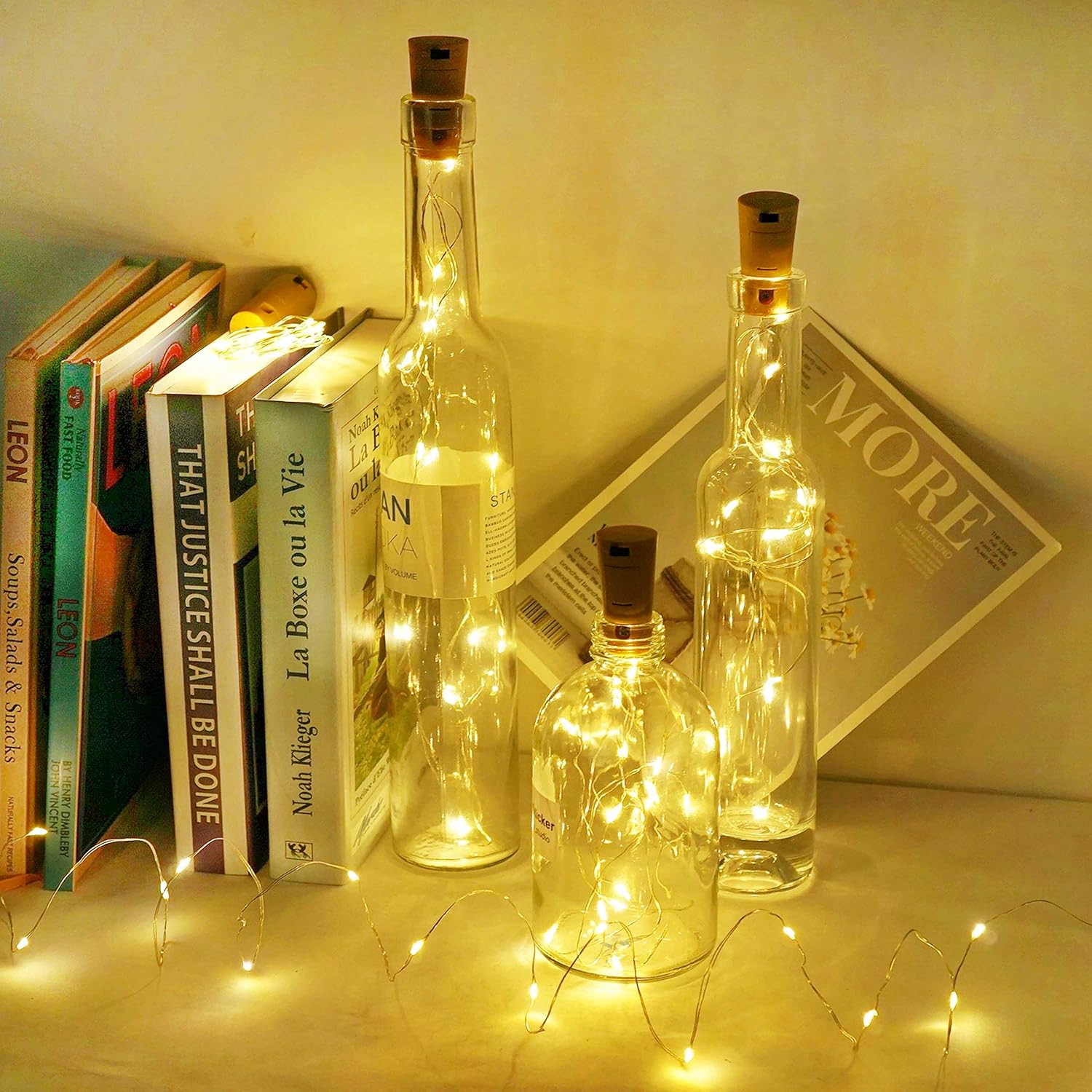 - 【A New Way To Recycling Bottles With Romance】: NO TIMER(Bottle NOT included)!!!! The lights are battery operated. Most Popular Warm White, 15 Super Bright Led Bulbs on a 59 Inches Long and Thin Sliver Wire. The low heat emission and eco-friendly design Cute Beautiful Bottle Cork String Lights Could Create Romantic, Peaceful and Warm Atmosphere After Decoration.