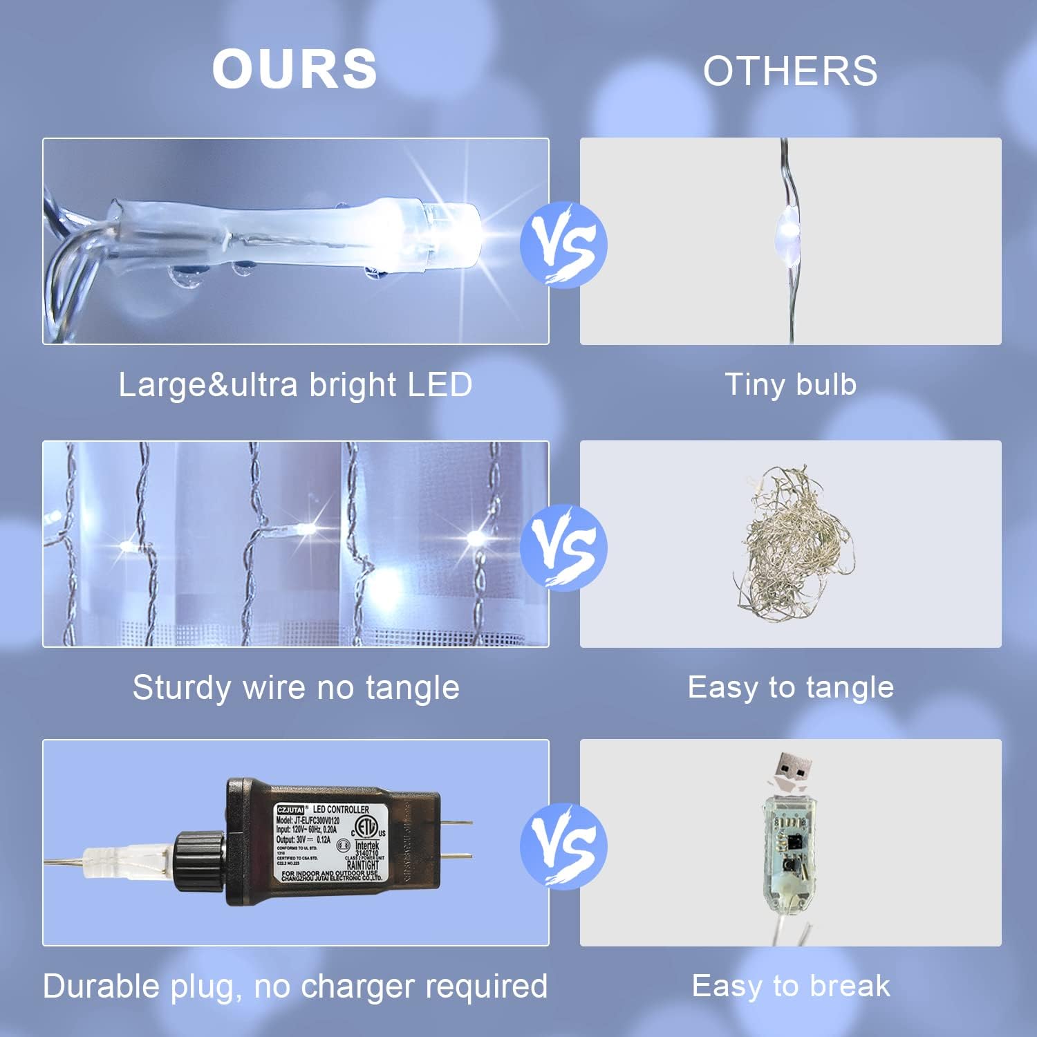 - POPULARLY USED FOR DECORATING INDOOR AND OUTDOOR - Super long white curtain fairy lights can be used for decorating your bedroom, garden, patio, party, wedding, ceiling, festival, vacation, Valentine's Day, Christmas, Diwali, Ramadan, graduate party, baby shower backdrop without any worrying about weather damage. The attractive fairy lights will bring you a different visual experience and a happy mood.