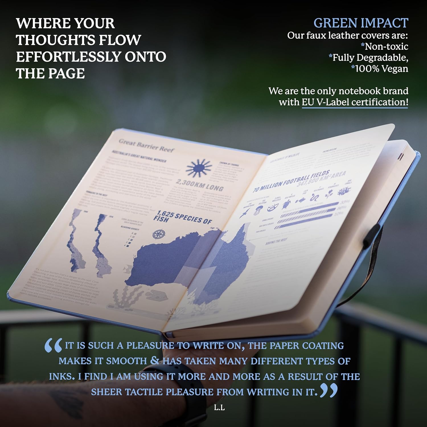 - A5 NOTEBOOK WITH LOTS O' FEATURES: Dingbats notebooks ooze quality - this hardcover bound leather notebook is crafted with PU vegan leather Cream 100gsm pages, 16 pages of perforated paper, an elastic closure and pen holder. It's complete with a silhouette of the Great Barrier Reef, an infographic spread about the endangered region in the endsheets and an inner pocket for a little added detail - the perfect gifts for loved ones
