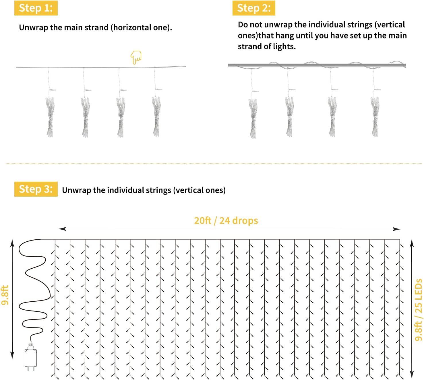 - Easy installation: These lights were neatly packed, which makes it easy to unpack them without creating a big tangle. For easier installation please do not unwrap the individual strings that hang until you have set up the main string of lights. Lighted Length: 20 feet × 10feet. Distance between strings can be adjusted with tape or zip tie to fit your needs. A double layer will make the lights look better with a more solid fill