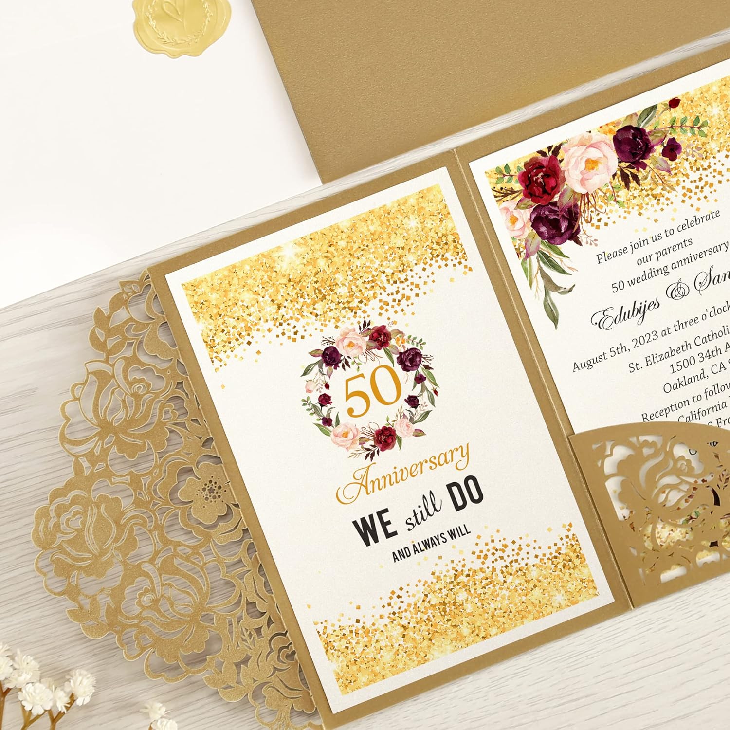 DORIS HOME 50pcs Laser Cut Wedding Invitations with Envelopes Gold, 4.7x7.1 Personalized Invitation Cards for Wedding, 50 Anniversary Invitations with Envelopes