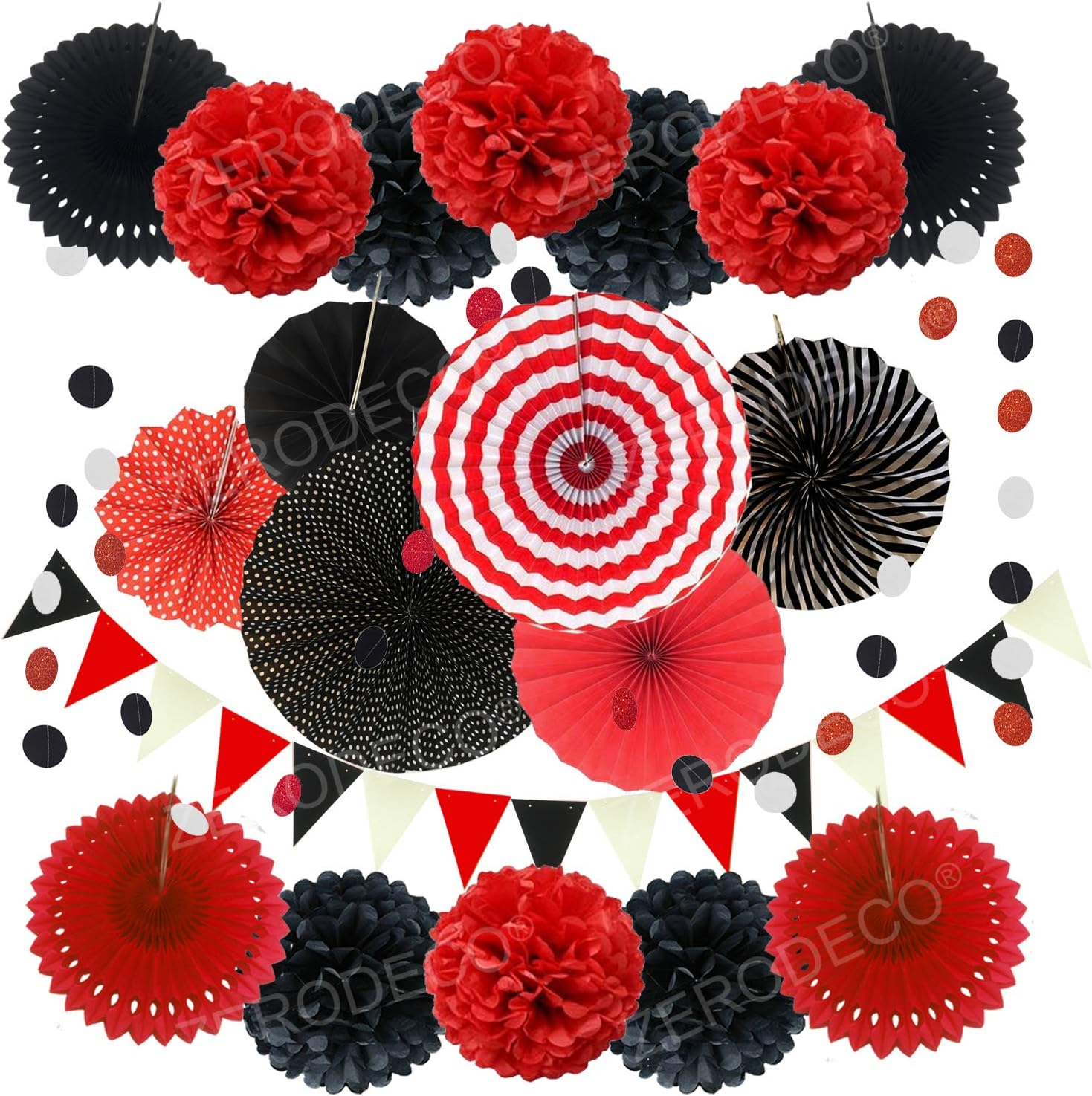 ZERODECO Party Decoration, 21 Pcs Black and Red Hanging Paper Fans Pom Poms Flowers, Garlands String Polka Dot and Triangle Bunting Flags for Minnie Mouse Birthday Parties Baby Showers Wedding