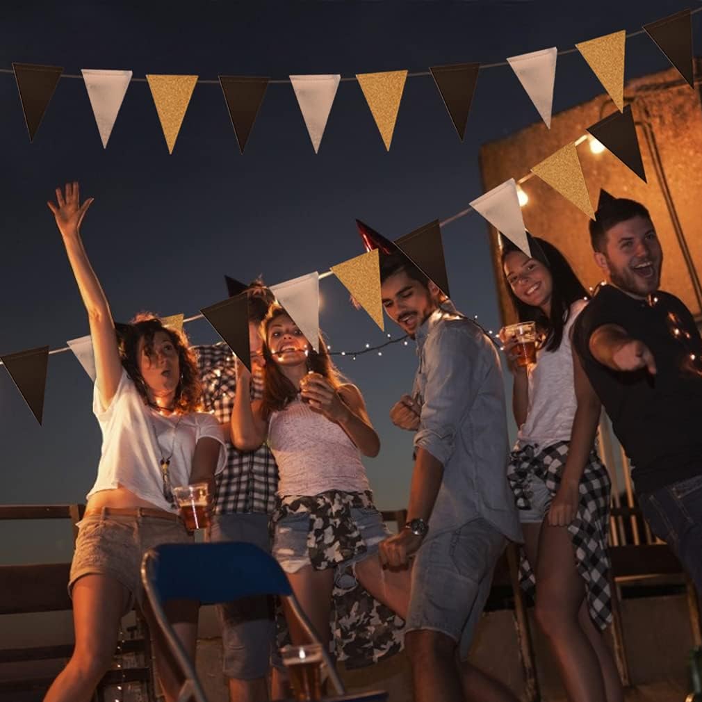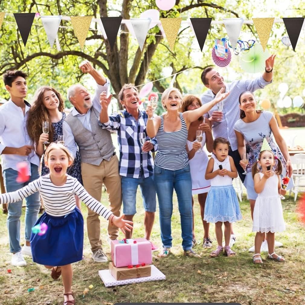 Triangle Flag Bunting Banner, MerryNine 3 Pack 30 Feet Vintage Style Pennant Banner for Wedding, Baby Shower, Event & Party Supplies 78pcs Flags (Triangle Flag - Black Silver Gold Glitter)