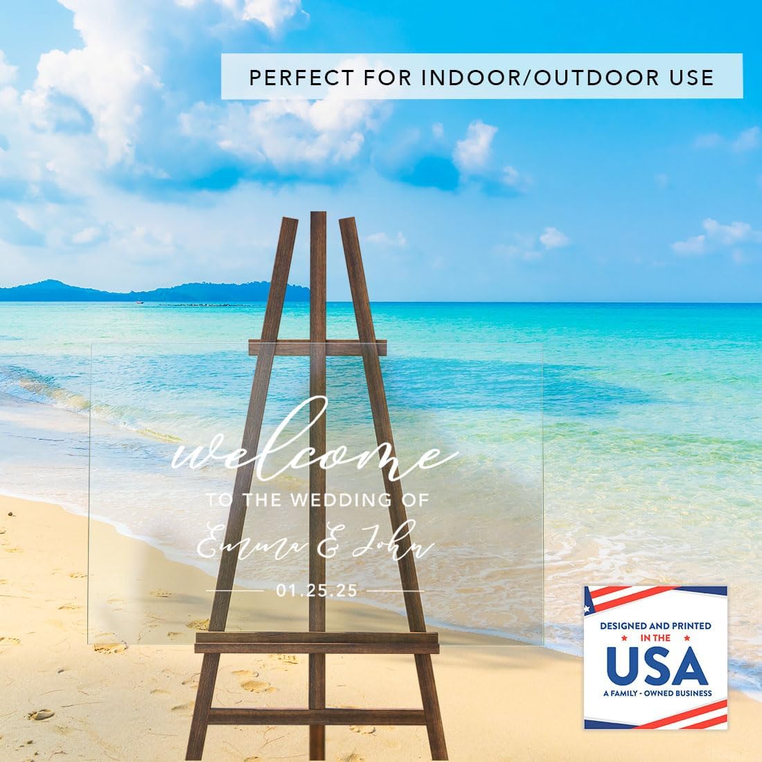 - VERSATILE DISPLAY OPTIONS Your custom names and date are directly printed onto durable acrylic with premium fade-resistant inks. Your sign is peel-proof and smudge proof. Made in USA. Our wedding entrance sign fits all sturdy easels or stands, making this wedding welcome sign without stand perfect for both indoor and outdoor use.