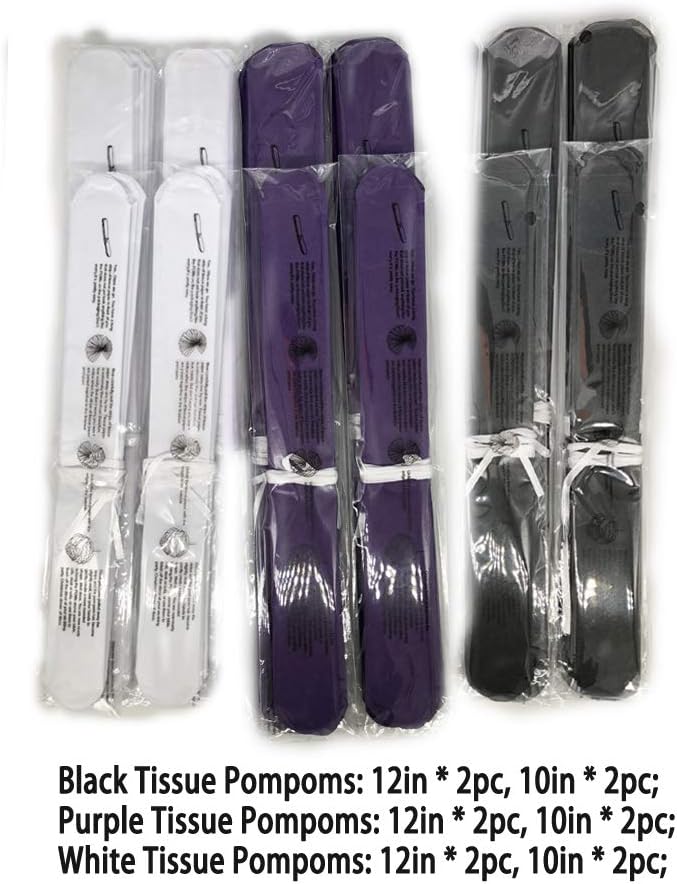 - TISSUE PAPER FLOWER BLACK PURPLE AND WHITE 12pc in 2 sizes,package include black crafts flower 4pc (2pc in 12'' and 2pc in 10''), purple crafts flower 4pc(2pc in 12'' and 2pc in 10''), white crafts flower 4pc(2pc in 12'' and 2pc in 10'')