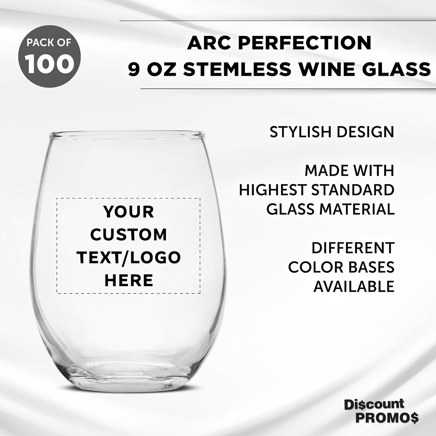 Custom Stemless Wine Glass 9 oz. Set of 100, Personalized Bulk Pack - Great for Wedding Favors, Bachelorette Party Decorations, Party Favors, Color Bottom - Clear