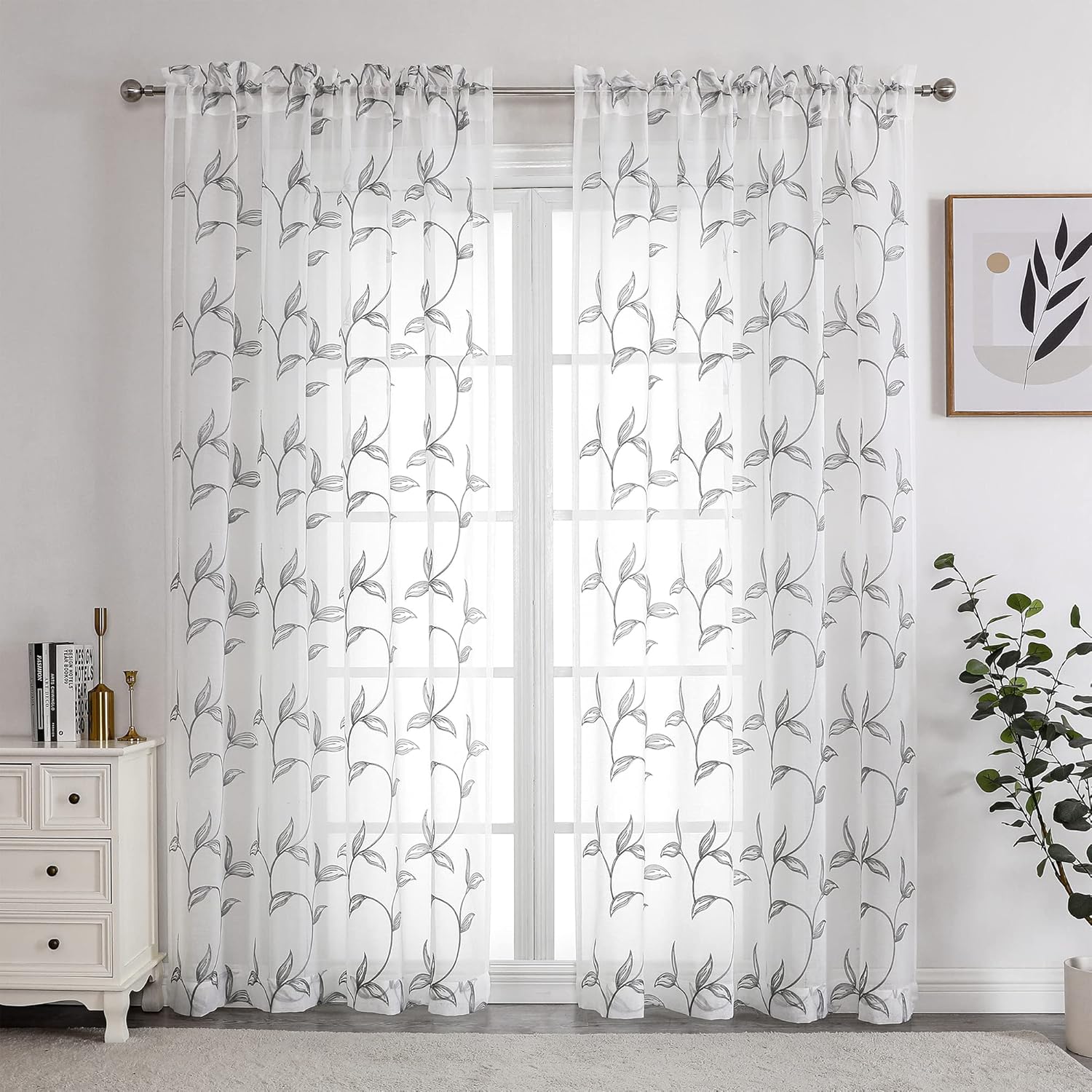 - Elegant embroidered design: window sheer curtains design grey vine leaves embroidered pattern, add style and elegance to living space, perfect for Bedroom, living room, kids room or any window.