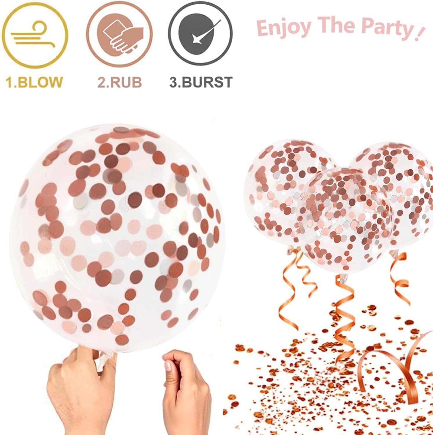 - 【Rose Gold Balloons 】- This rose gold confetti balloons set come with : 20 pcs rose gold latex balloons, 10pcs rose gold confetti balloons, 10pcs rose gold metallic chrome balloons,10pcs white latex balloons, one rose gold ribbon (33 feet total). Offering you a good choice for making nice indoor or outdoor decoration, to create more joyful time for families and friends.
