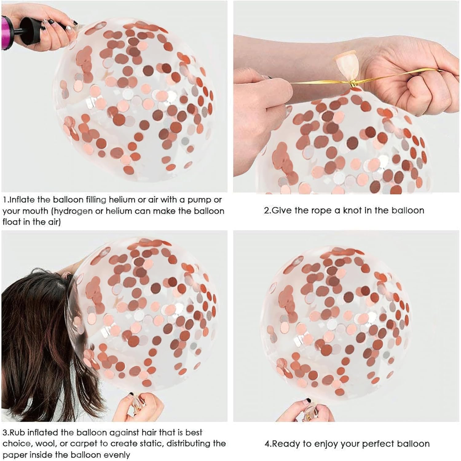 - 【 Confetti Balloon】- Due to the rose gold confetti is heavier than helium, the confetti moves in the direction of gravity. Rubbing the outer side of the balloon on the hair (the best way )or silk, wool, will help the confetti stick to the balloon. A balloon pump is strongly recommended. This will make the balloons look more beautiful.