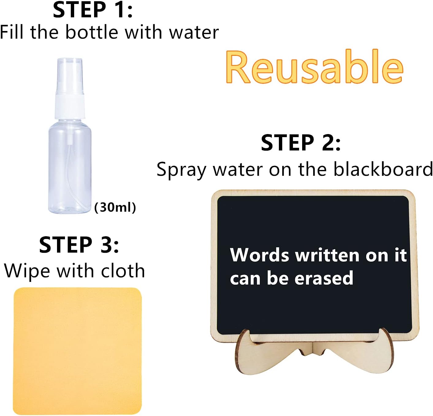 - Wood Material: Our mini chalkboards and stands are made of High quality wood,It won't get moldy because of dampness ackage includes 20 mini chalkboards, the head of the chalkboard is 4" X 3", there is plenty of room for you to write