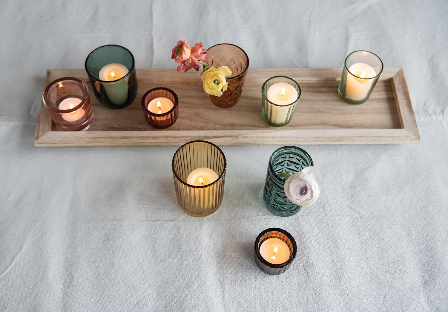 - Each glass votive measures 2 to 2.5 inches in diameter and 2 to 4.25 inches in height; The wood tray measures 22 inches in length, 5.5 inches in width, and 4.25 inches in height