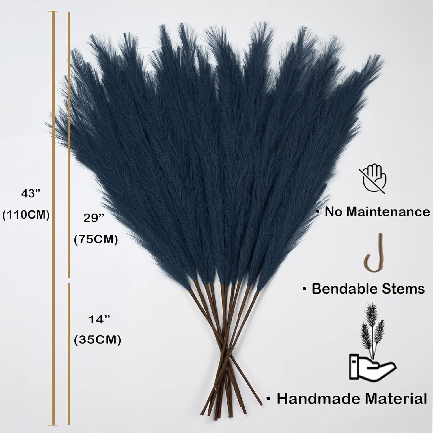 Faux Pampas Grass 6 Stems, Artificial Pampas Grass - 43 inch Total Extra Large Pompass Grass Tall Pompous Boho Flower Arrangement and Floor Vase Filler Home Decor for Room Wedding Party (Blue)