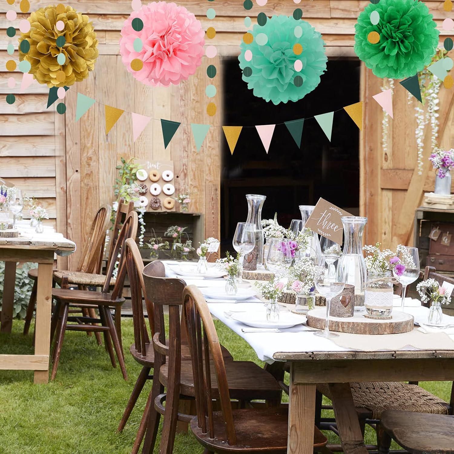 - 【Sage-Green Pink Gold Party Kits】The party decorations kits include 8pcs tissue paper flowers: 4pcs 8" and 4pcs 10" in three color, 1pcs Triangle Flags,1pcs circle dots paper garland, 20pcs tassel garland. Total 30pcs.