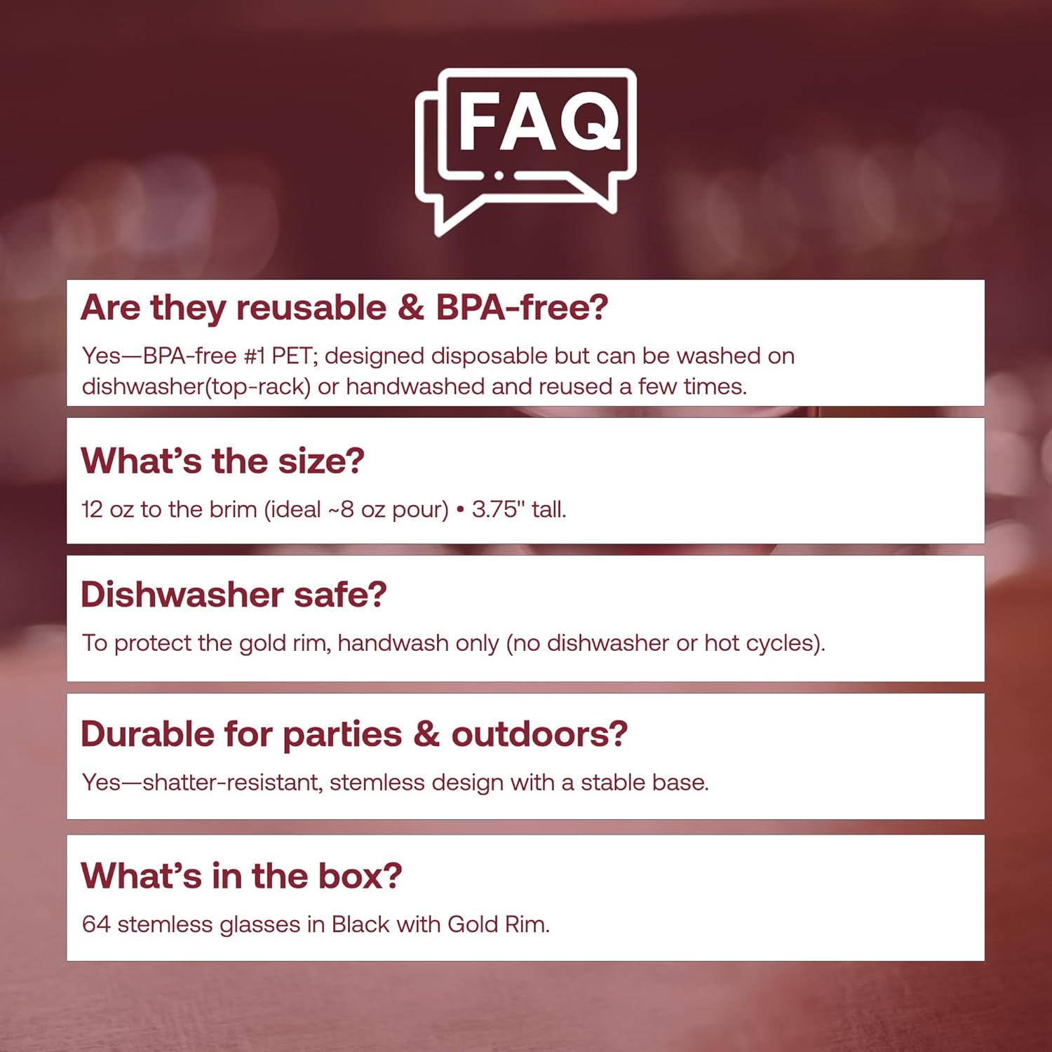 - DISPOSABLE OR REUSABLE CONVENIENCE – Choose between disposable wine glasses for easy cleanup or reusable plastic wine glasses for multiple events, adding flexibility to your hosting needs.