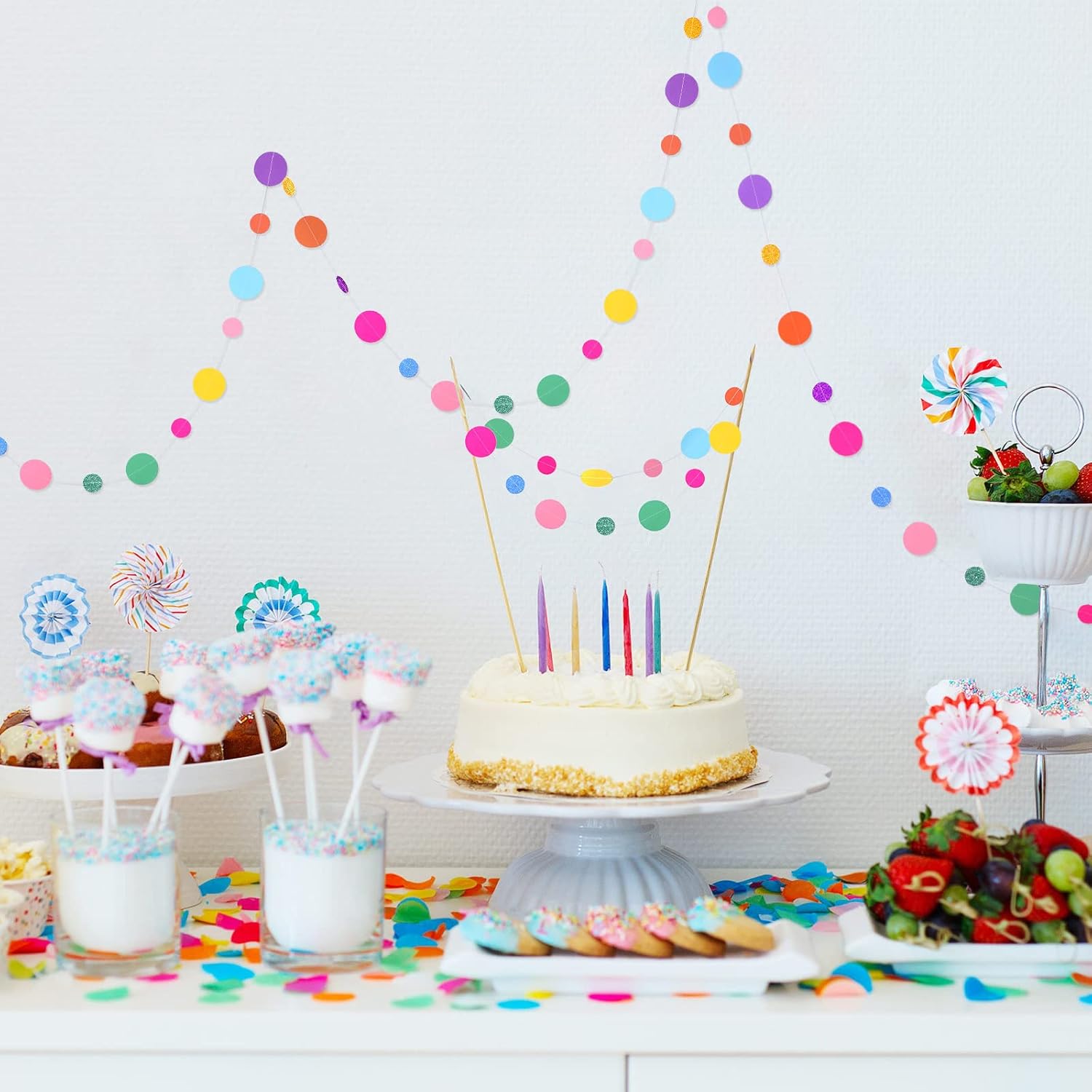 Outus 5 Pieces Colorful Dots Paper Garland Round Glitter Garland Hanging Confetti Streamers Backdrop for Candy Birthday Classroom Halloween Trunk or Treat Car Decoration (Rainbow)