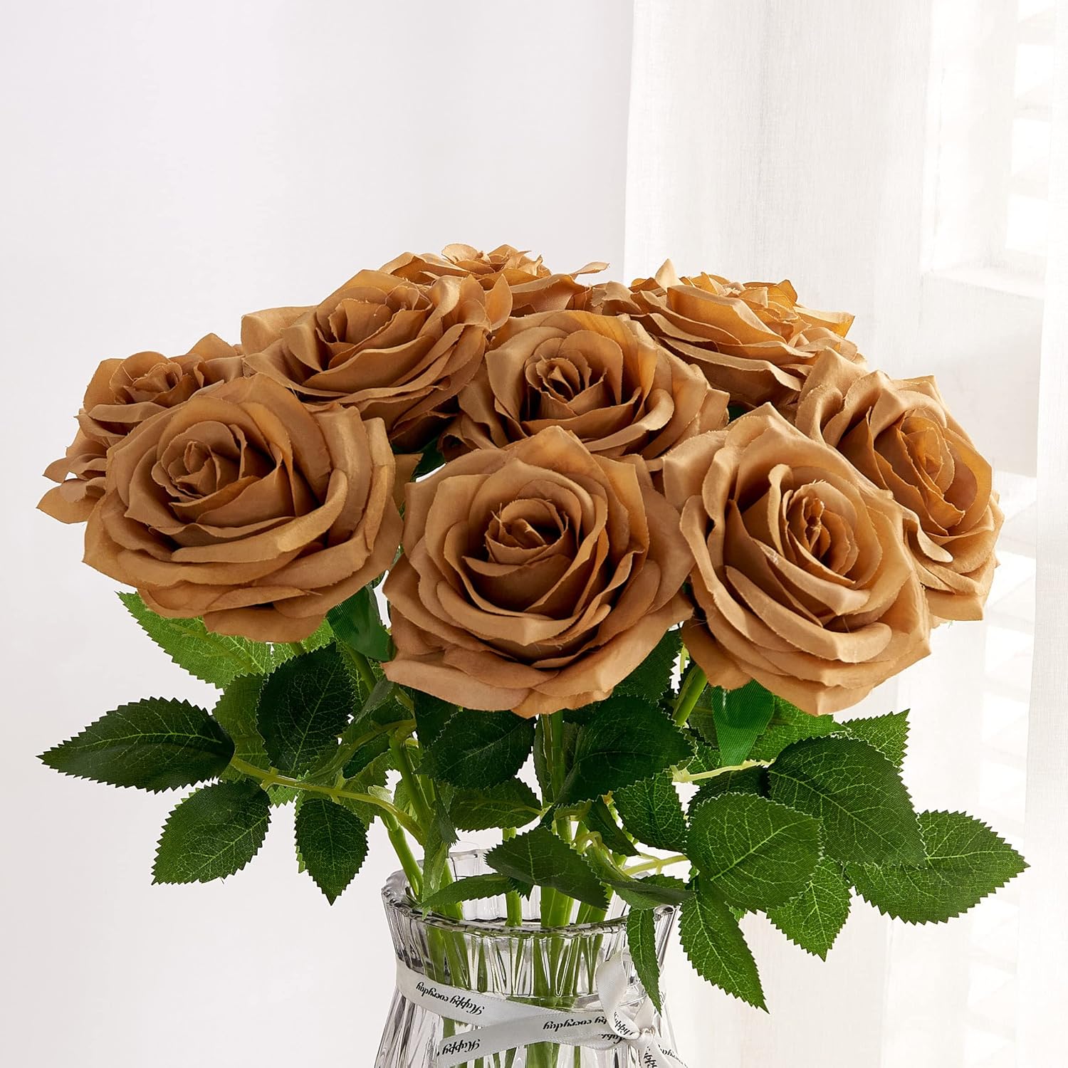 Artificial Rose 10pcs Open Flower Bouquet Faux Rose Stems for Wedding Arrangement, Bridal Bouquet, Centerpiece, Fake Faux Silk Flowers (Toffee)