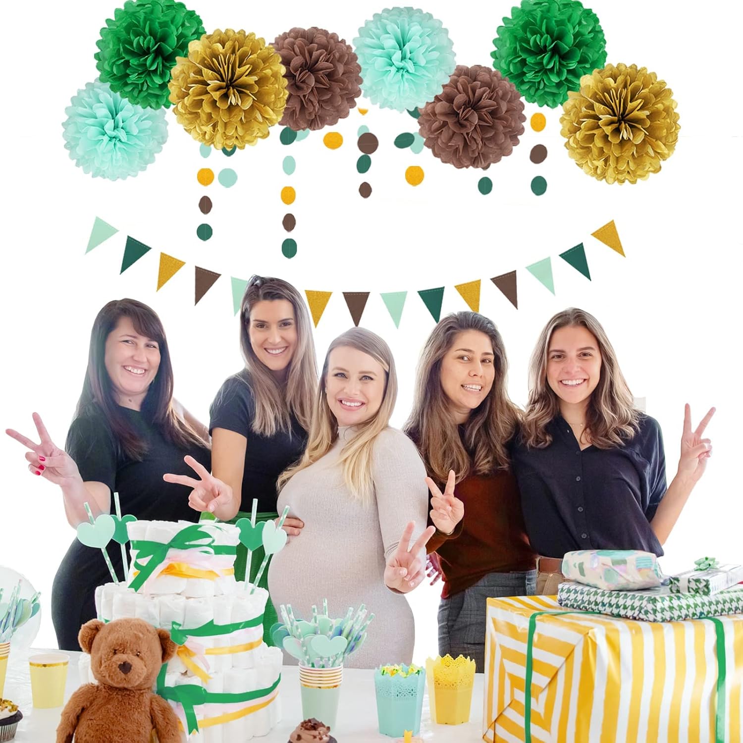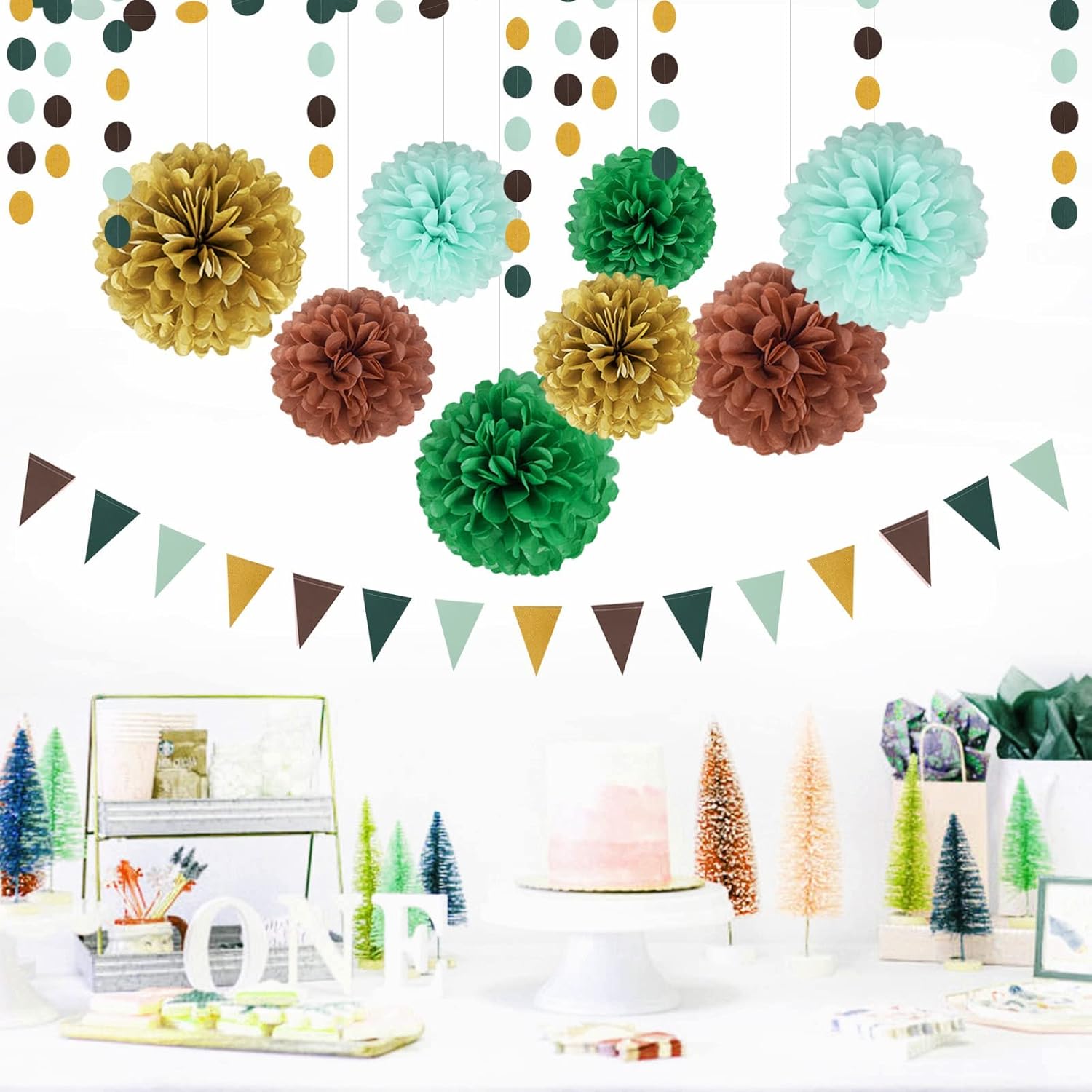 - 【Sage Green Mint Brown Gold Party Decorations】Kit include 8pcs tissue paper pom poms,4pcs 8",4pcs 10".1pcs 13ft circle garland.1pcs 9.5ft tissue paper tassel garland with 20pcs tassel.1pcs 9.7ft triangle flags banner.