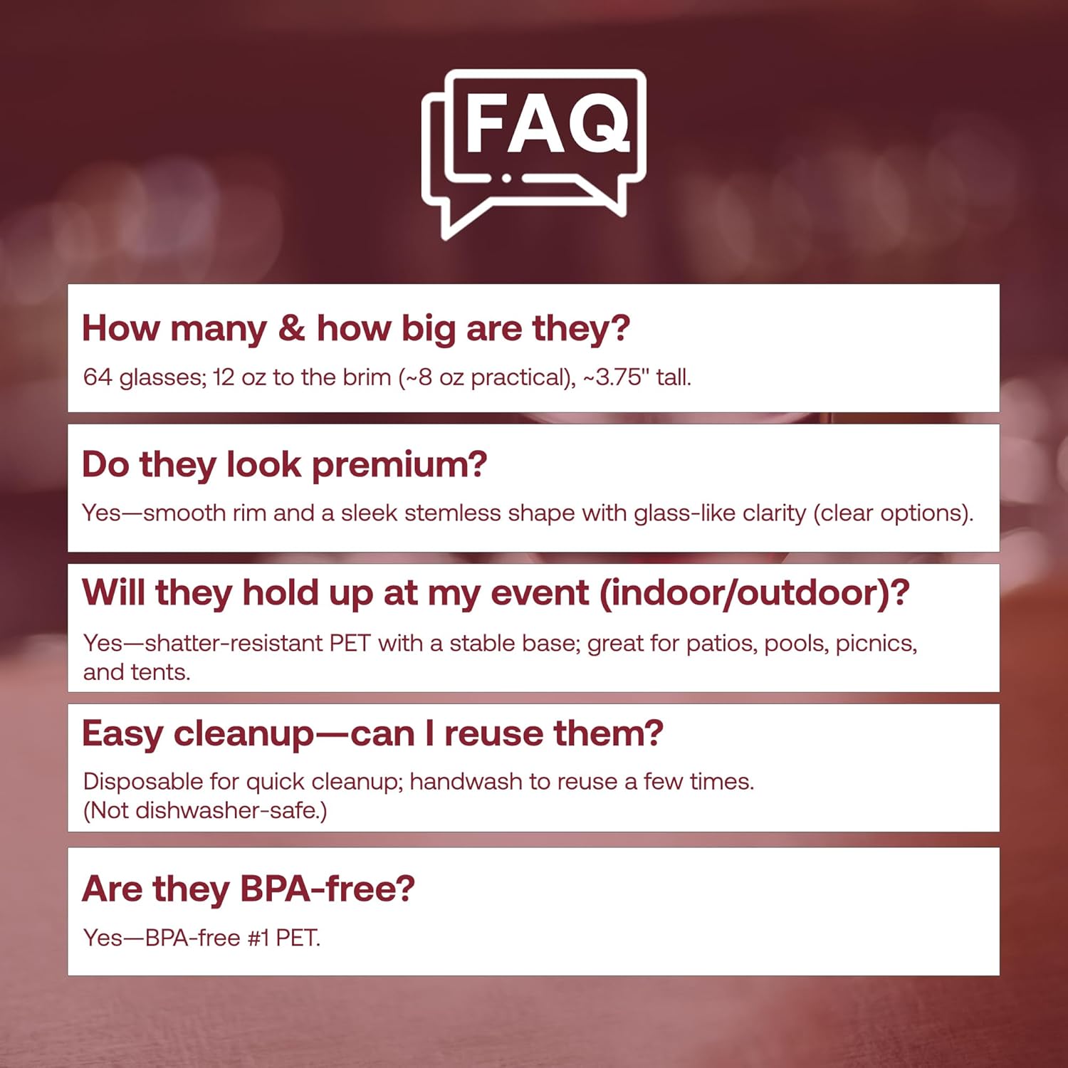 - PACK & CAPACITY: Case of 64 black disposable stemless wine glasses (4 packs of 16). Flush 12 oz, practical 8 oz—elegant fancy plastic cups for receptions, showers, holidays, and everyday entertaining.