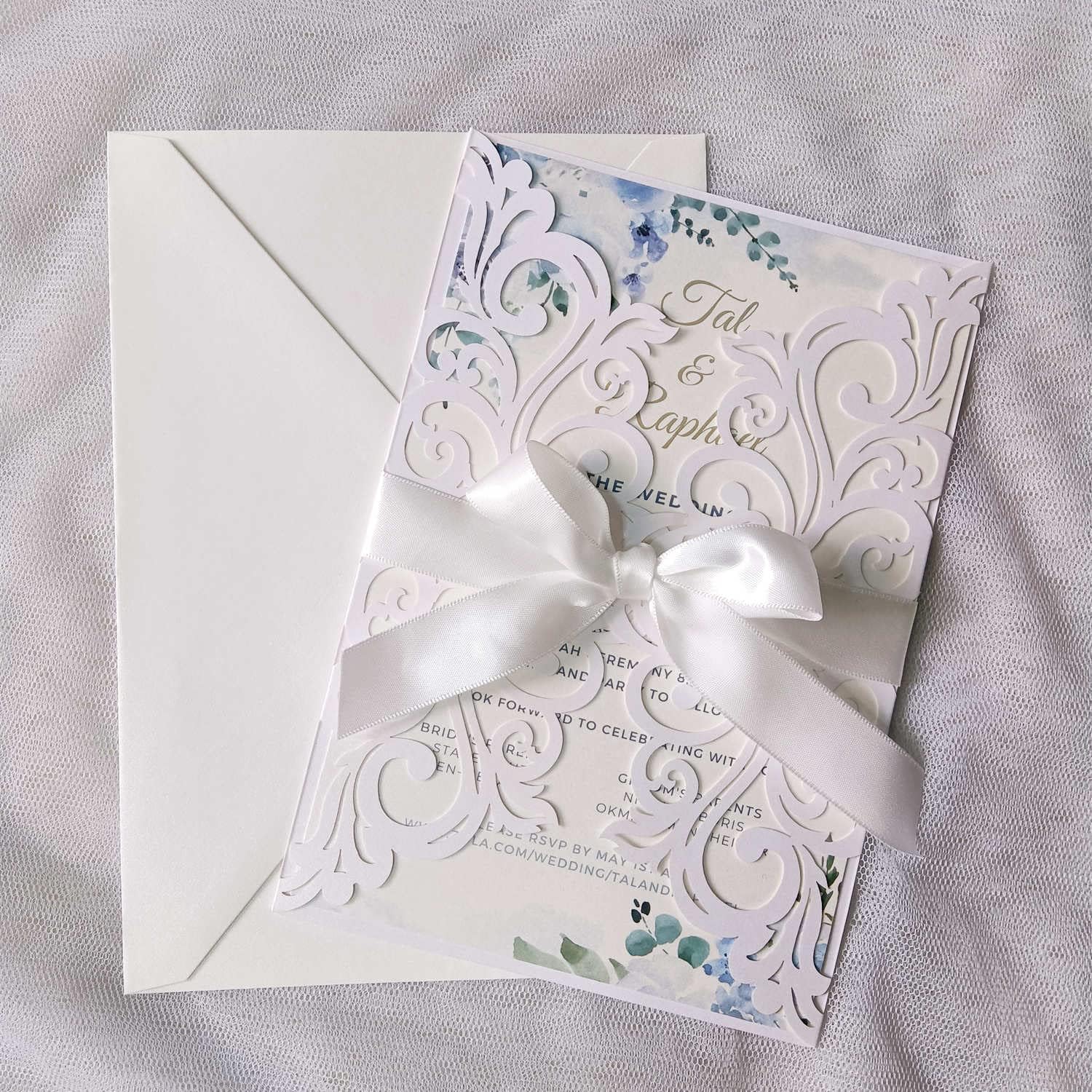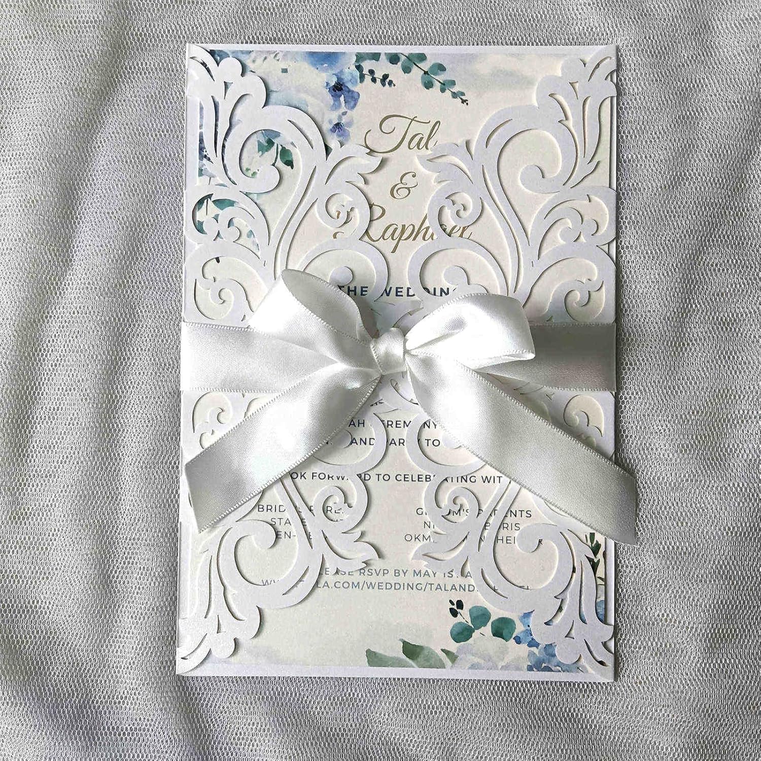 - Package including: 25 * Laser Cut Invitations Pockets + 25 * Cream Envelopes+25 * Blank Inner Sheets +25 * Ribbons