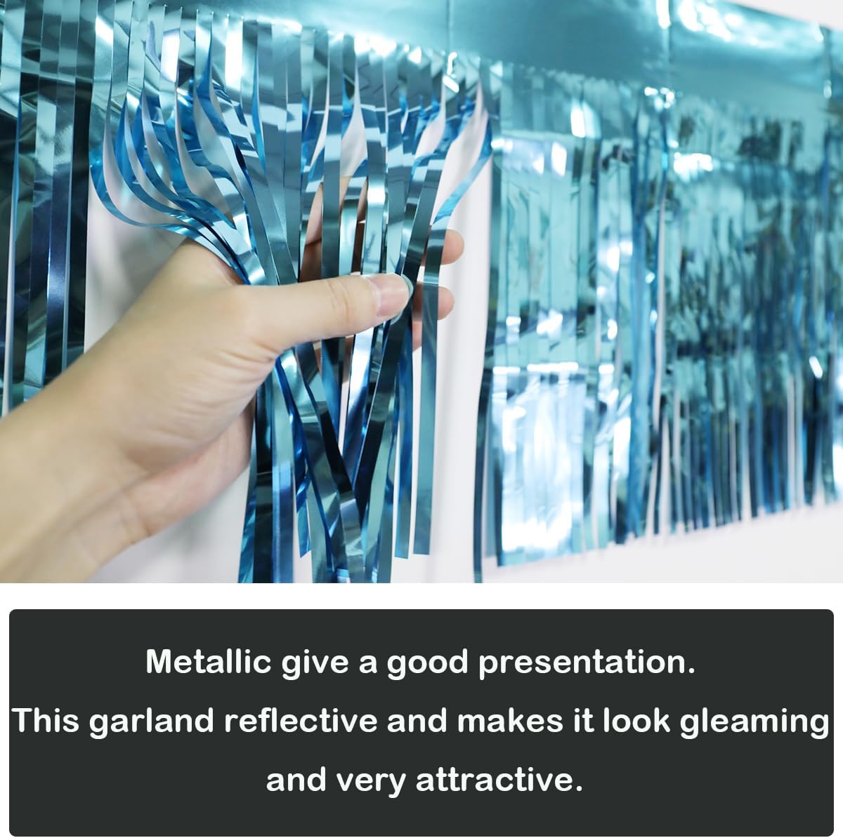 - Made of high quality metallic foil, lightweight and shiny. Metallic give a good presentation. This garland reflective and makes it look gleaming and very attractive.