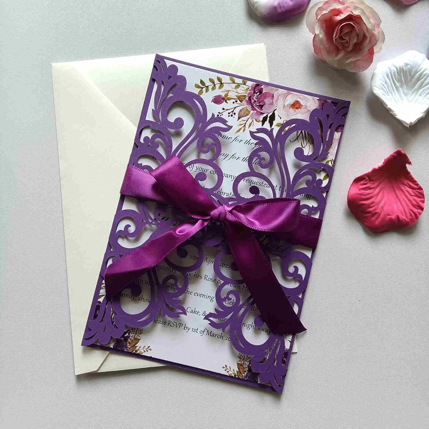 25PCS Dark Purple Laser Cut Wedding Invitations Cards with Envelopes,Blank Inner Sheets,Ribbons for Wedding Bridal Shower Quinceañera Engagement Birthday Invites