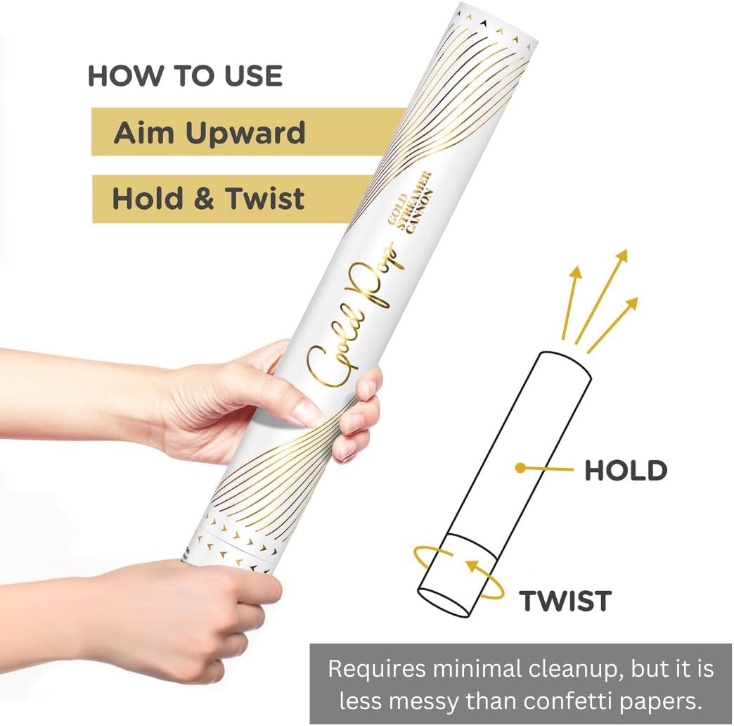- 🎉 EASY POINT & TWIST ACTION - Don't need the strongest arms to blow up these babies! Point upwards away from people and twist to shoot, GOLD Streamer is loaded on top of compressed air and is launched by twisting the cannon. Operation manual is included inside the box.
