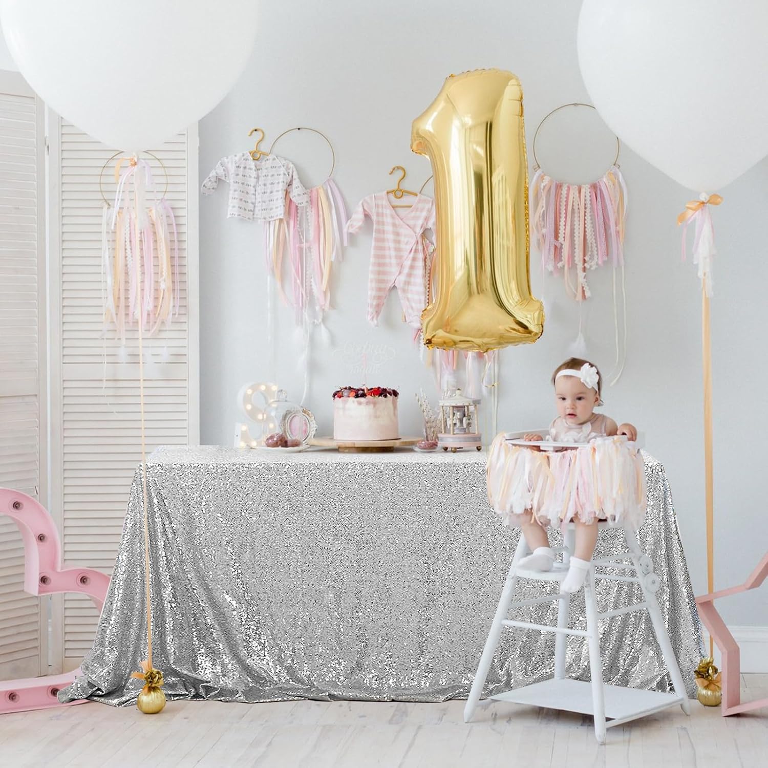 - Package Include: Your package will include 1 silver tablecloth measuring 60 W by 102 L inch. These sparkly table tablecloths are ideal for wedding, event table decorations for the reception.