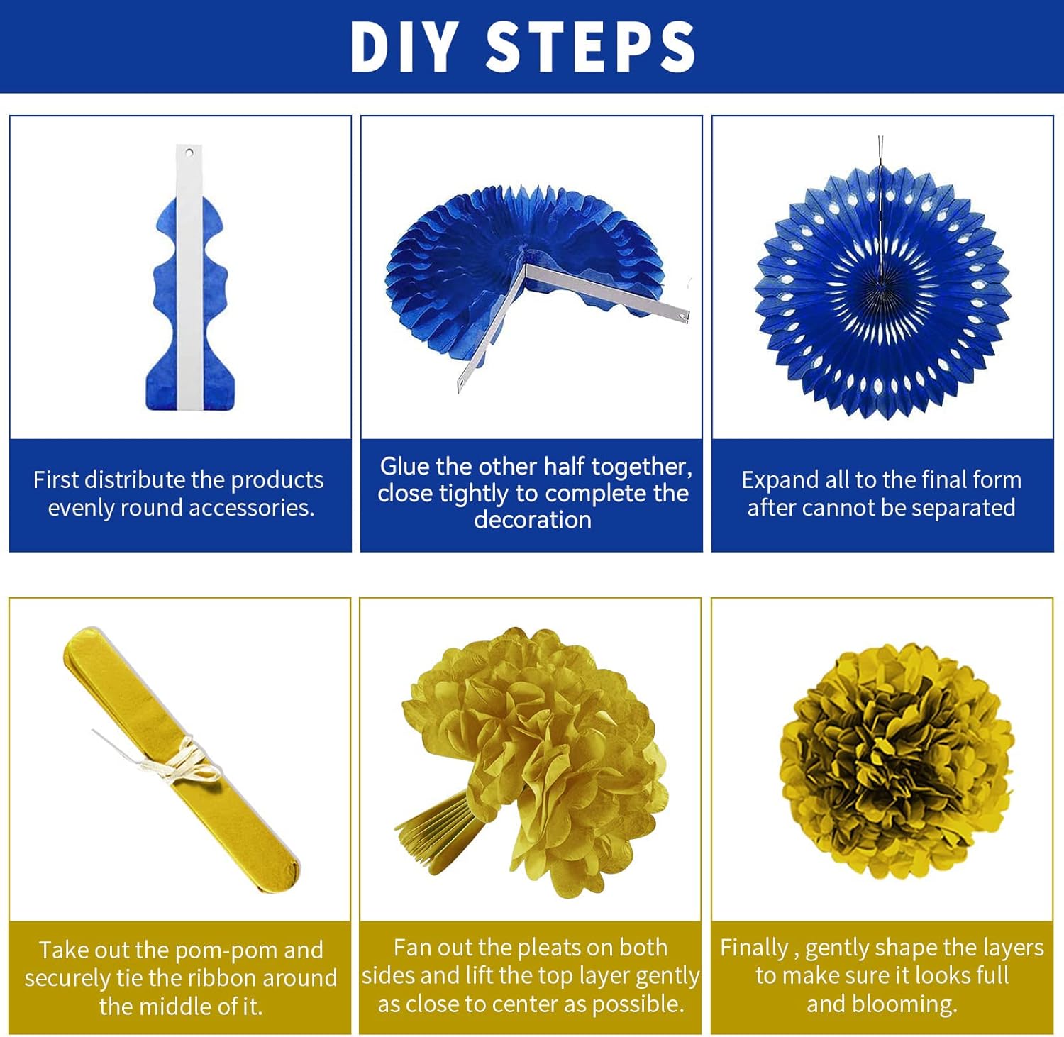 - Easy To Assemble: Pom poms need you to spend a few minutes peeling apart and letting them become fluffy, then unfold and slot the lanterns and honeycomb balls into place, unroll garlands gently to avoid tangling, finally hang them to decorate your party. Moreover, they are reusable, just folding them for store if you want to reuse them.