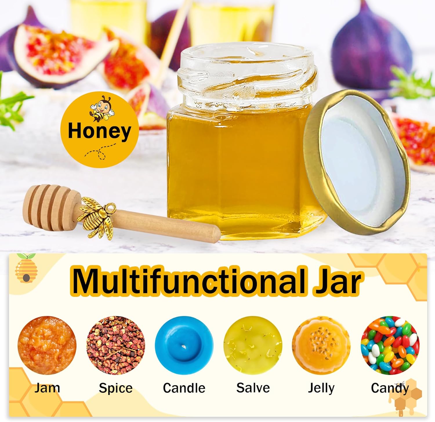 - Great Value Mini Honey Jars Set: This set includes 48 hexagon mini honey jars with dippers, lids, bee charms, gift bags, tags, and 25m of jute twine. Everything you need to craft thoughtful party favors or sweet handmade gifts with ease.