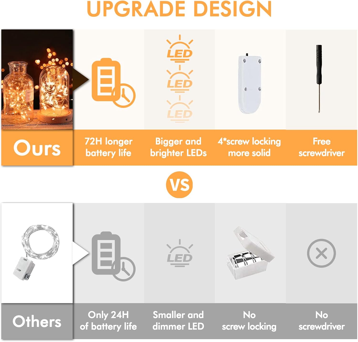 - ✨ 【Long battery life】The battery-powered fairy light battery case contains 2*CR2032 battery. The battery life is up to 72 hours, which is longer than the 24 hours of other fairy string lights. We have a screwdriver for every box of fairy lamps. When the light of your LED fairy lights becomes weak, you only need to buy new batteries and change them with a screwdriver to use them again. The operation is easy and simple