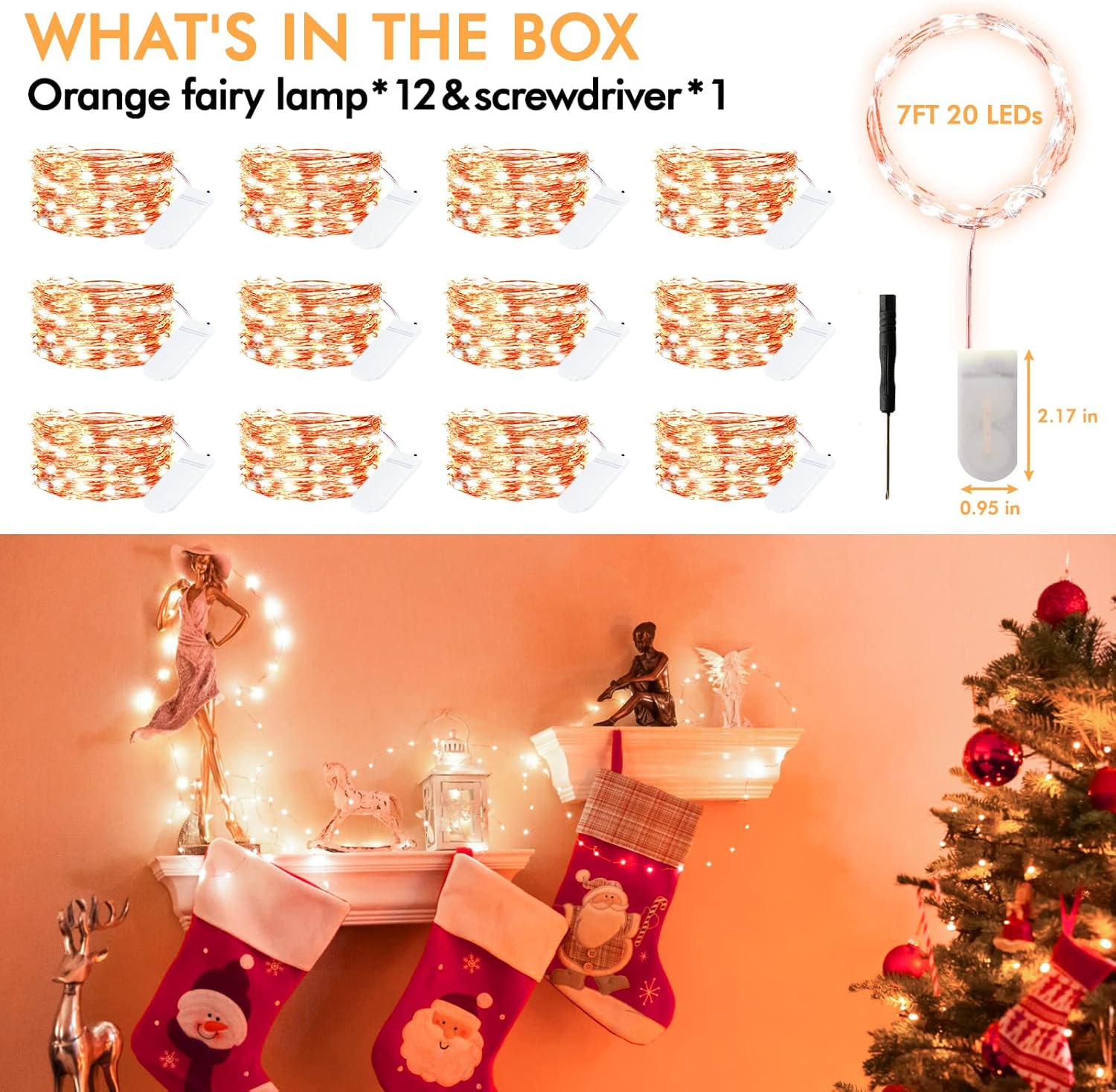 - ✨【12 Packs High-Quality Fairy Lights】 There are 12 packs of LED orange fairy lights inside each box, Each string of fairy string lights is equipped with 20 super bright mini LDE lamp beads, The light flashes 360 degrees without glare and soft light to protect your eyes. The fairy lamp wire is 7ft long and made of soft copper wire. It can be bent into any shape you like or wrapped around anything you want to decorate. These fairy lights can make everything that is decorated by them dazzling