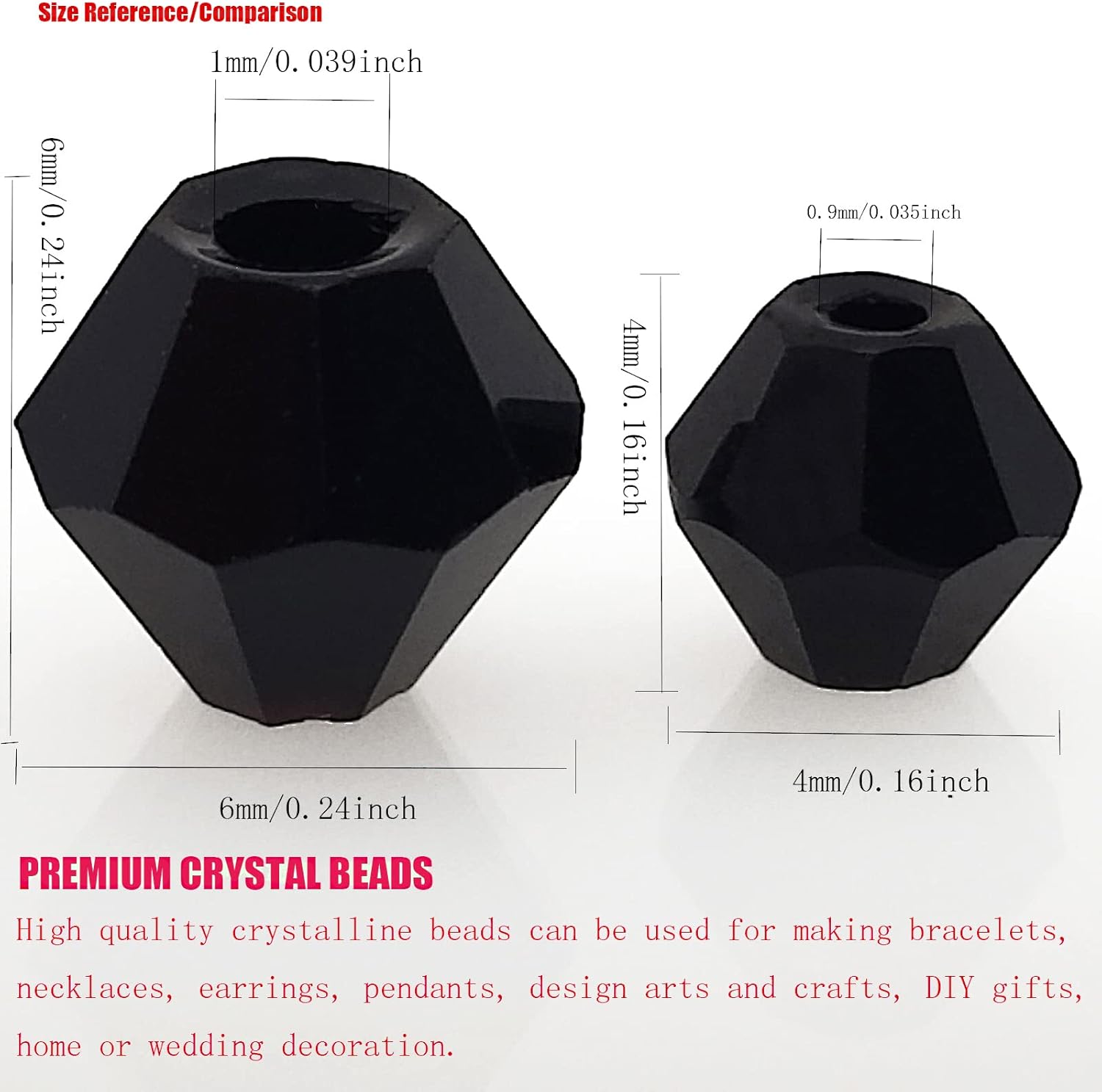 - 【PACKAGING and SIZE】 Package includes 1800Pcs 4mm Bicone faceted crystal glass beads in black color.Bead size: 4mm (or ~ 0.16 inch); Hole diameter ~ 0.9mm ( ~ 0.035 inch).In addition, we provide you with some stretchy cord and add an organza bag.Let your family and friends enjoy DIY happy time together.Kindly note: Please make sure this small bead size meets your needs before placing an order,thank you.