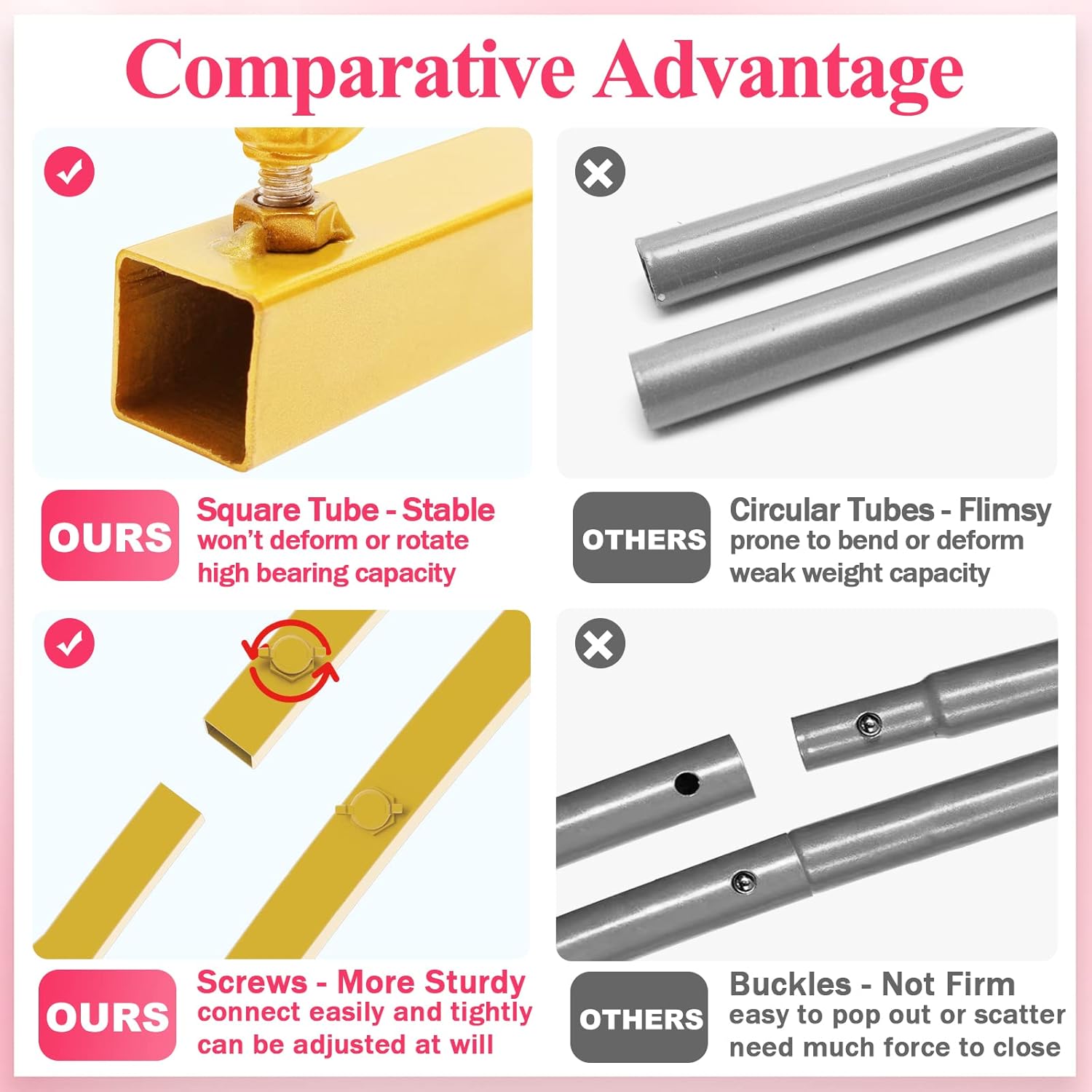 - 【Stable Base Additional Crossbar】Metal arch backdrop stand with a cross bar on the base making the metal gold wedding arch more stable. Adding some decorative elements to the base can also increase stability. Decorate square wedding arch with flowers, greenery, garlands, tulle swags or vines to make your event stand out.