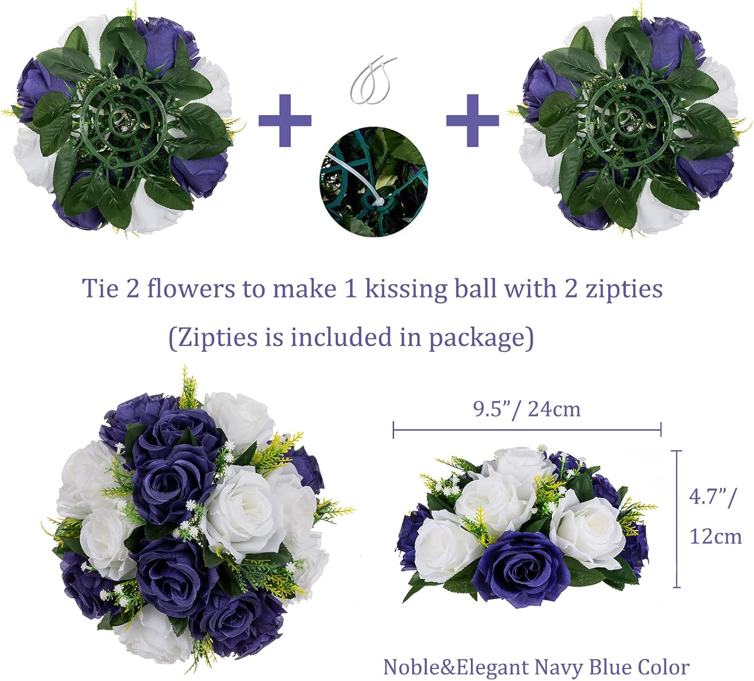 - 3-in-1 Centerpieces Table Decoration: Each piece measures 9.5 inches by 4.7 inches. These navy blue white flower ball arrangements for centerpieces offer multiple setup options thanks to a 10 cm diameter patented base, which allows for direct placement on tables or compatibility with most stands and vases. They come with free zip ties, enabling you to join two halves together to form a full flower ball or hang them in any desired location