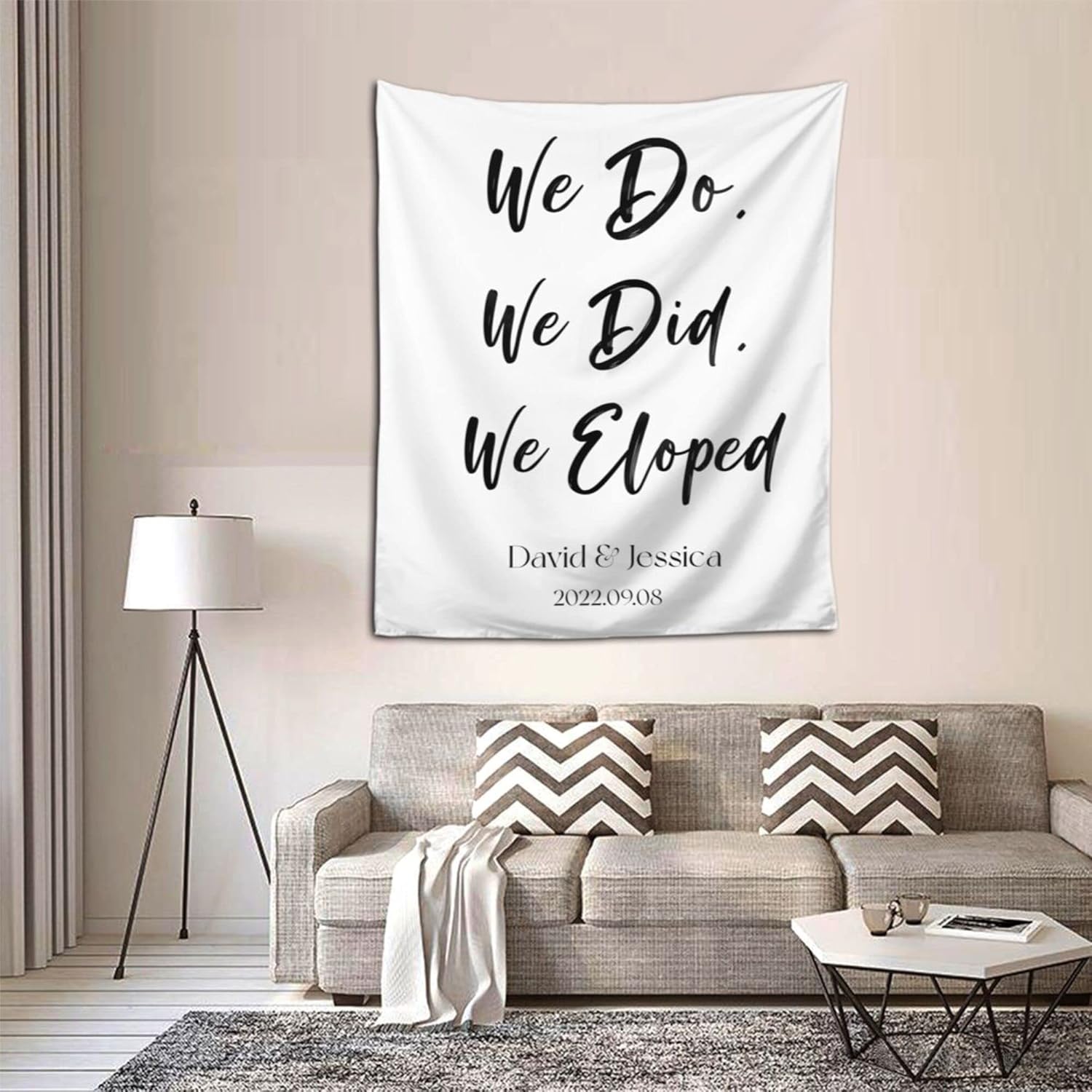 We Do, Did, Eloped Backdrop, Custom Tapestry with Names and Date, Personalized Calligraphy Wedding Banner for Ceremony, Rustic Sign, Reception Arch Decor