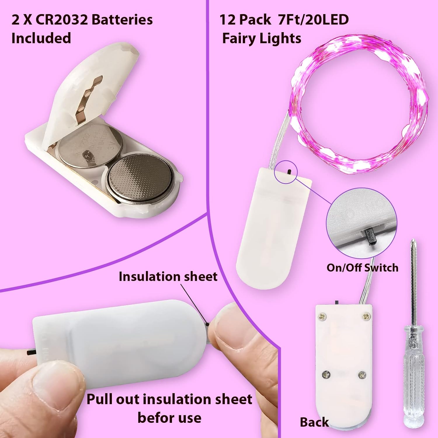 - 【Fantastic Pink Lights】: 12 separate mini fairy lights battery powered, made of 7ft high quality Silver coated copper wire, It’s flexible, strong and durable. Perfect for your crafts project , floral arrangements plants, signs, furniture glass jars, vases, wine bottles or other decorations.