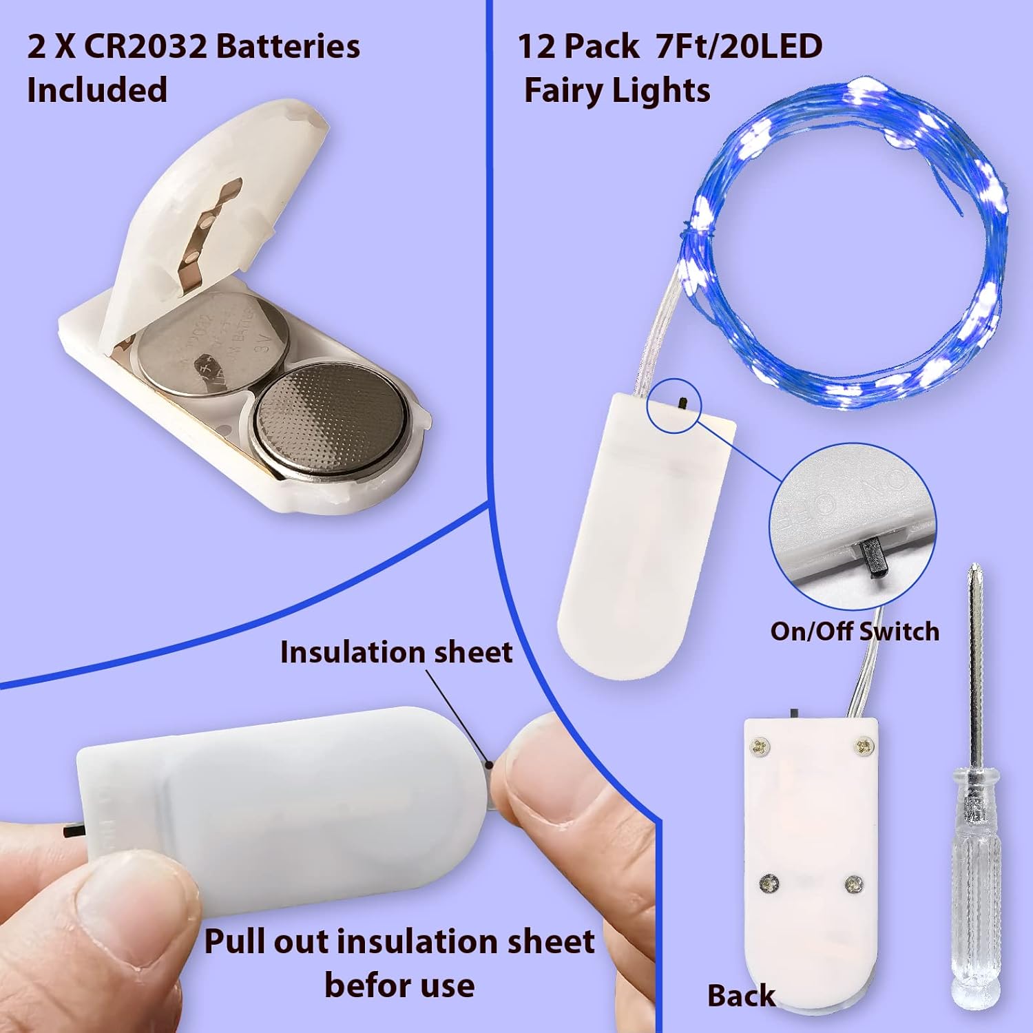 - 【Battery Powered】: Each set of lights powered by 2X CR2032 batteries( included and can be replaced). Although these support more than 72 hours continuous working, the actual use time will vary with the temperature and humidity of the environment. Small battery case (2*1 inches) is with on/off switch, very easy to hide into your design works. These are great for themed parties, sleepovers, or center pieces. Screwdriver included for easy operation.