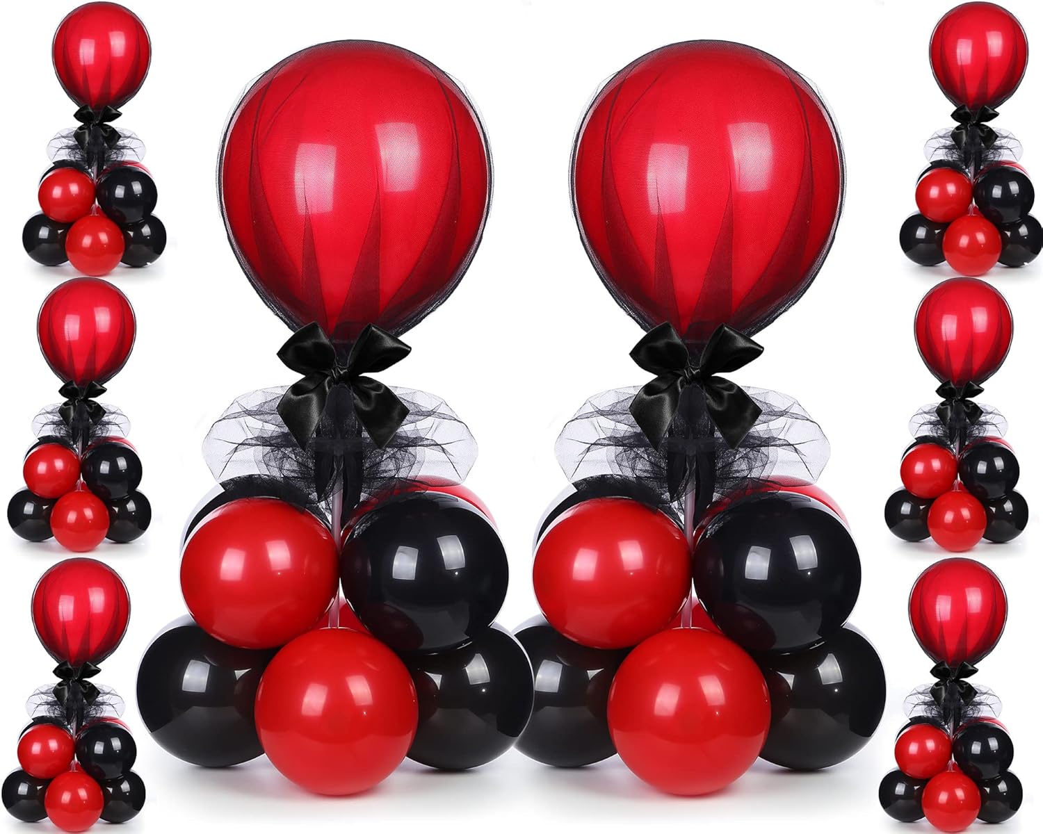- Included Components : 8 x Reusable tabletop balloon sticks, Balloon flower bases, 16 Round snaps, Black gauze covers, 72 Pieces of 5 inch latex balloons (36 black and 36 pomegranate red), 12 red balloons, thick ribbons, fixed holders 8 x Reusable tabletop balloon sticks, Balloon flower bases, 16 Round snaps, Black gauze covers, 72 Pieces of 5 inch latex balloons (36 black and 36 p… See more
