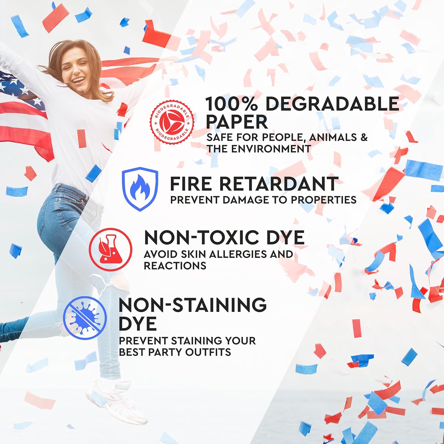 - 🎉 RED WHITE & BLUE CONFETTI - 100% BIODEGRADABLE - Confetti are made of lightweight fire resistant papers, 100% biodegradable. Color dye is non-toxic and won't rub onto your clothing. 100% safe for your party and good for the environment.
