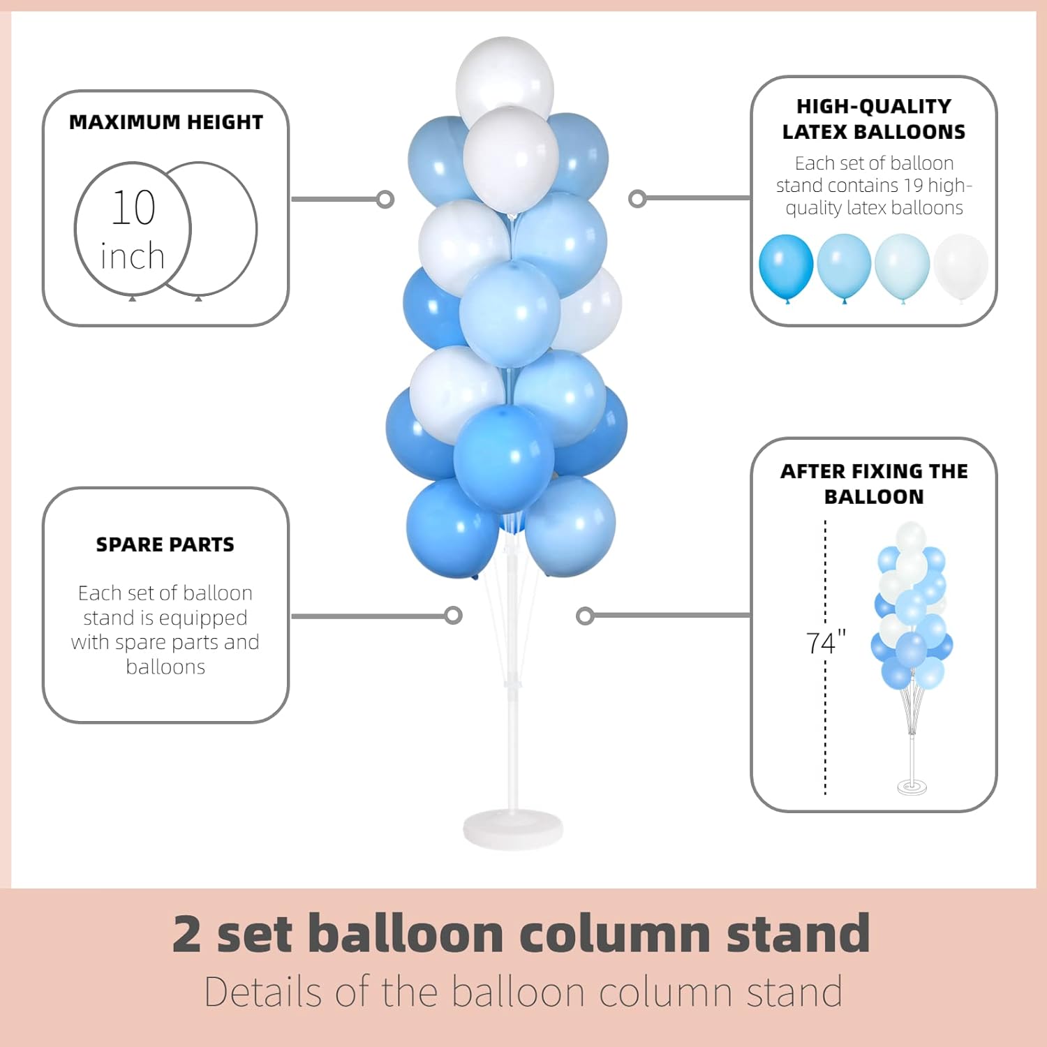 - COMPLETE SET FOR TWO BALLOON STAND - Balloon stand kit includes everything you need to build 2 set balloon stand,each kit includes 38 quality balloons (4 colors),each stand is 74" in height when fully assembled and can be customized as needed.gender reveal party,Christmas, anniversary,and any special celebration activities.