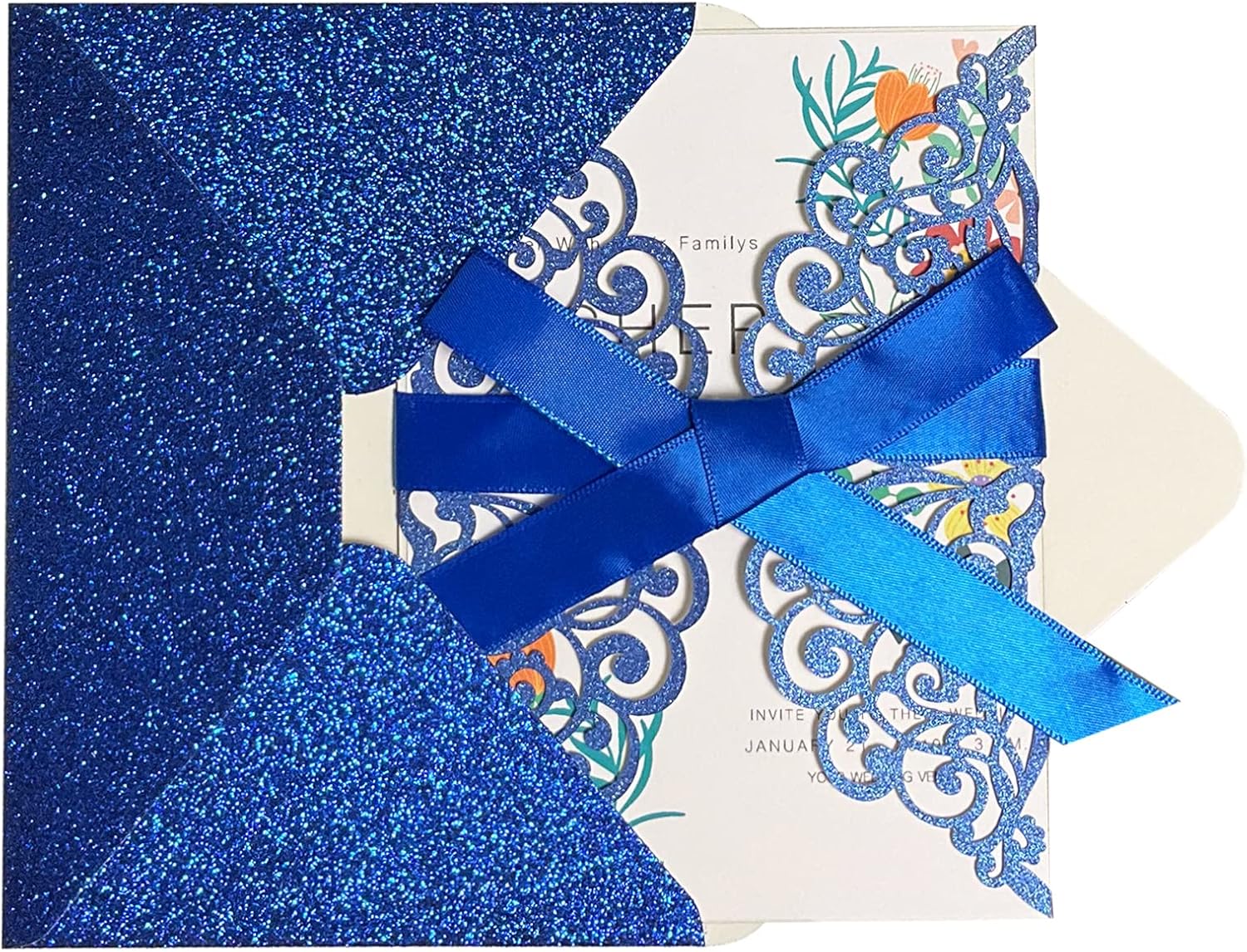 - 【Package include】50Pcs laser Cut Invitation Cards, 50Pcs A7 Glitter Envelopes, 50Pcs Inner Sheets (default blank),50 PcsIvory Blue ribbons, 50Pcs Gold envelopes seals.