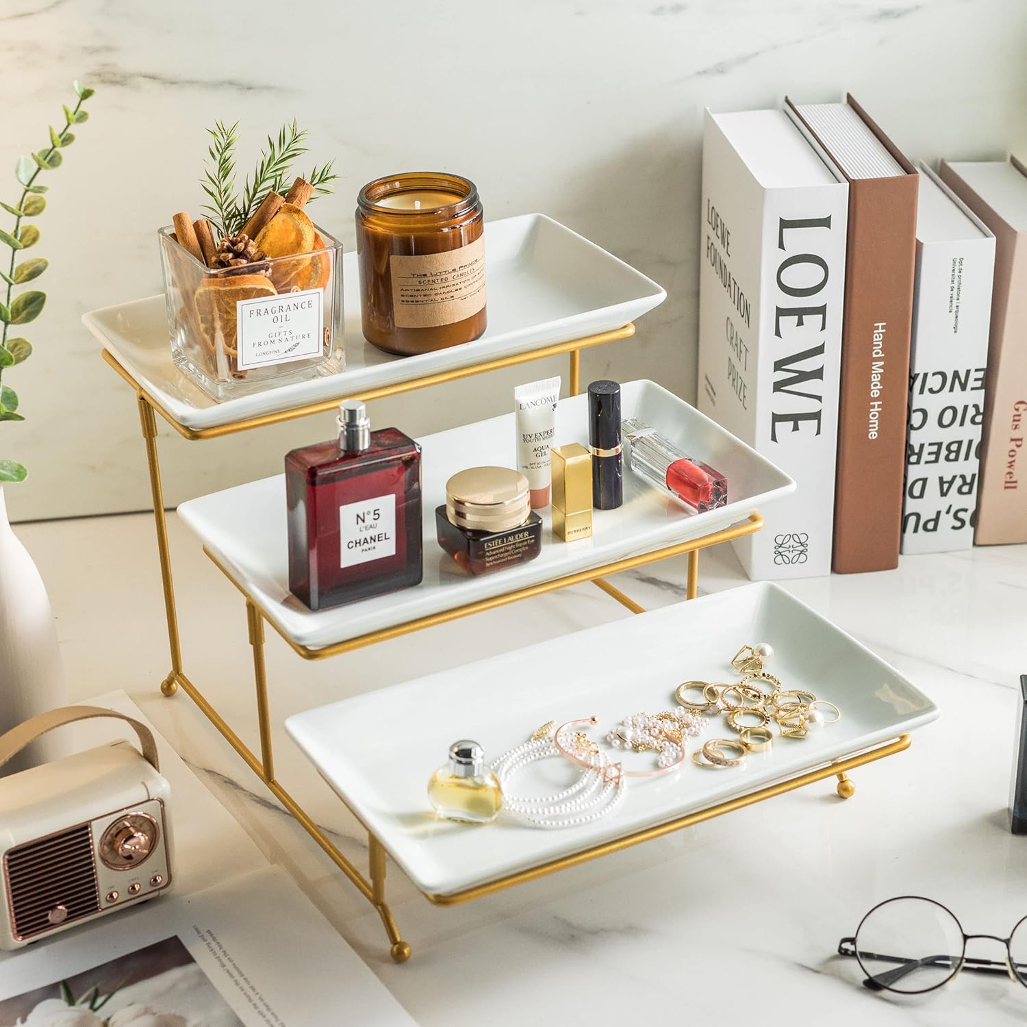 - Multipurpose Item: You can also use tiered tray as a decoration at home, such as placing small potted plants on your balcony and garden, placing tools, keys, and small parts as practical small item racks on the locker, or holding various kinds of cosmetics on the dressing table, etc. This 3 tiered tray stand is really a practical item that can surprise you