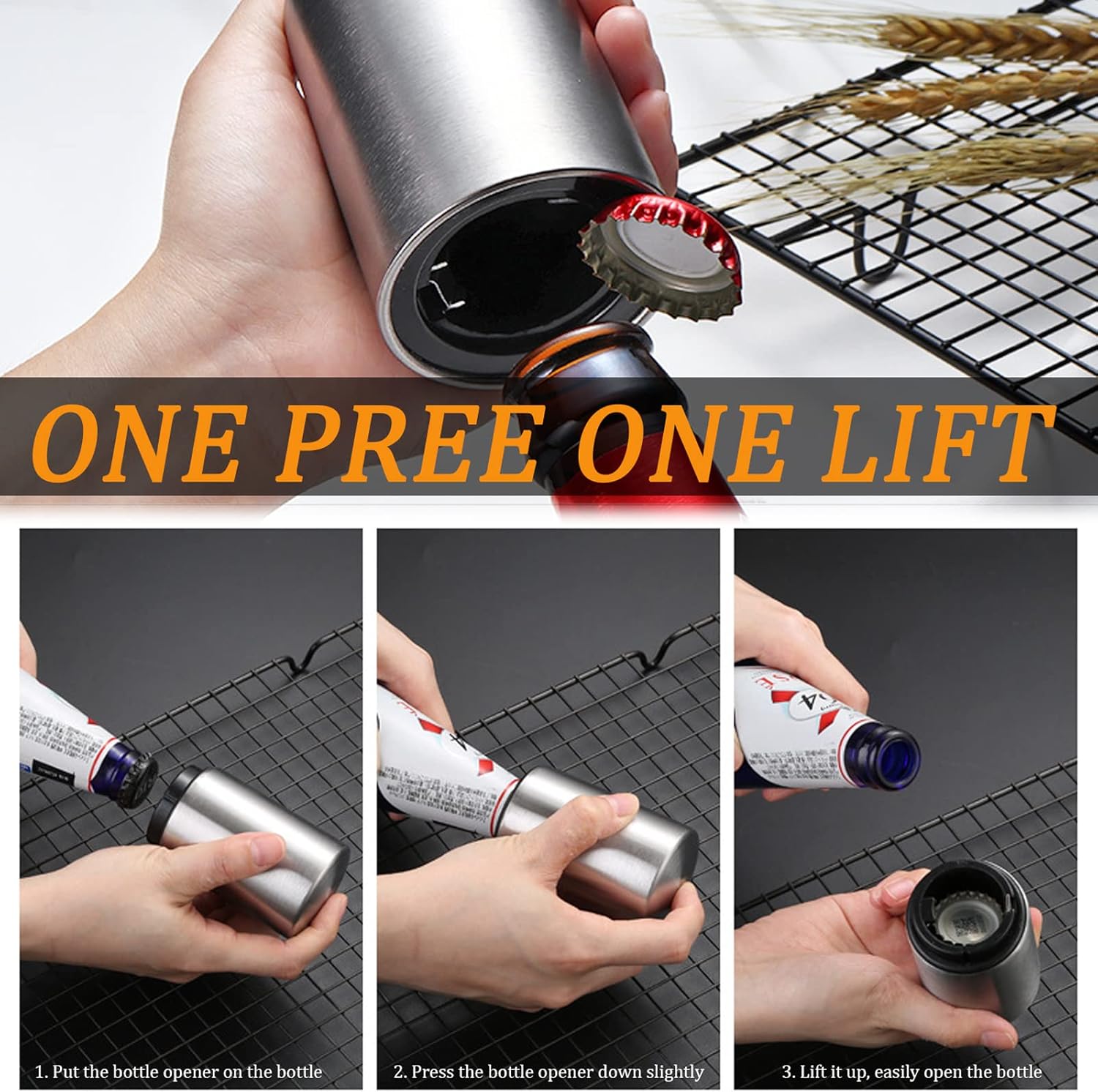 - WHAT YOU GET?-Great gifts choice, You will get 3pcs silver stainless steel automatic bottle opener. Only press and pop the bottle lid cap quickly. This push down bottle opener's easy-action and no wrist-twist design. It can easily remove the bottle cap from the bottle with one hand.