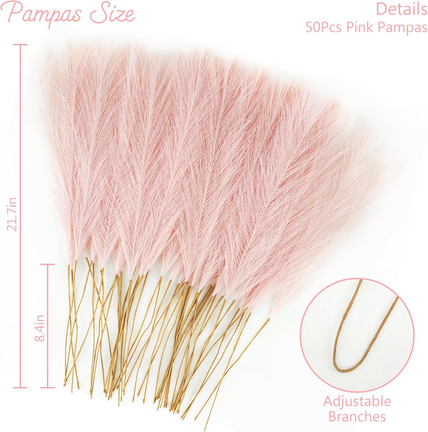 - Pink Pampas Grass Decor: You will get a pack of 50pcs artificial pampass grass, each stem 21.6”, and the heads of each stem is designed you can fluff them up for a fuller look, create a chic minimalist, or Bohemian modern display to complement your existing home arrangement