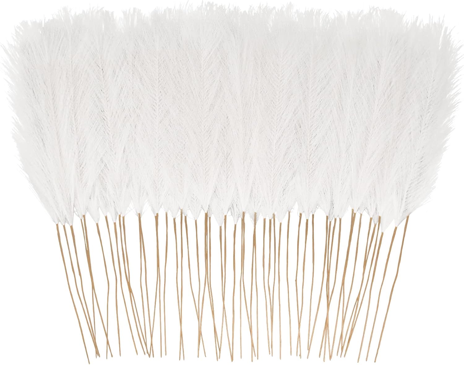- White Pampas Grass Decor: You will get a pack of 50pcs artificial pampass grass, each stem 21.6”, and the heads of each stem is designed you can fluff them up for a fuller look, create a chic minimalist, or Bohemian modern display to complement your existing home arrangement